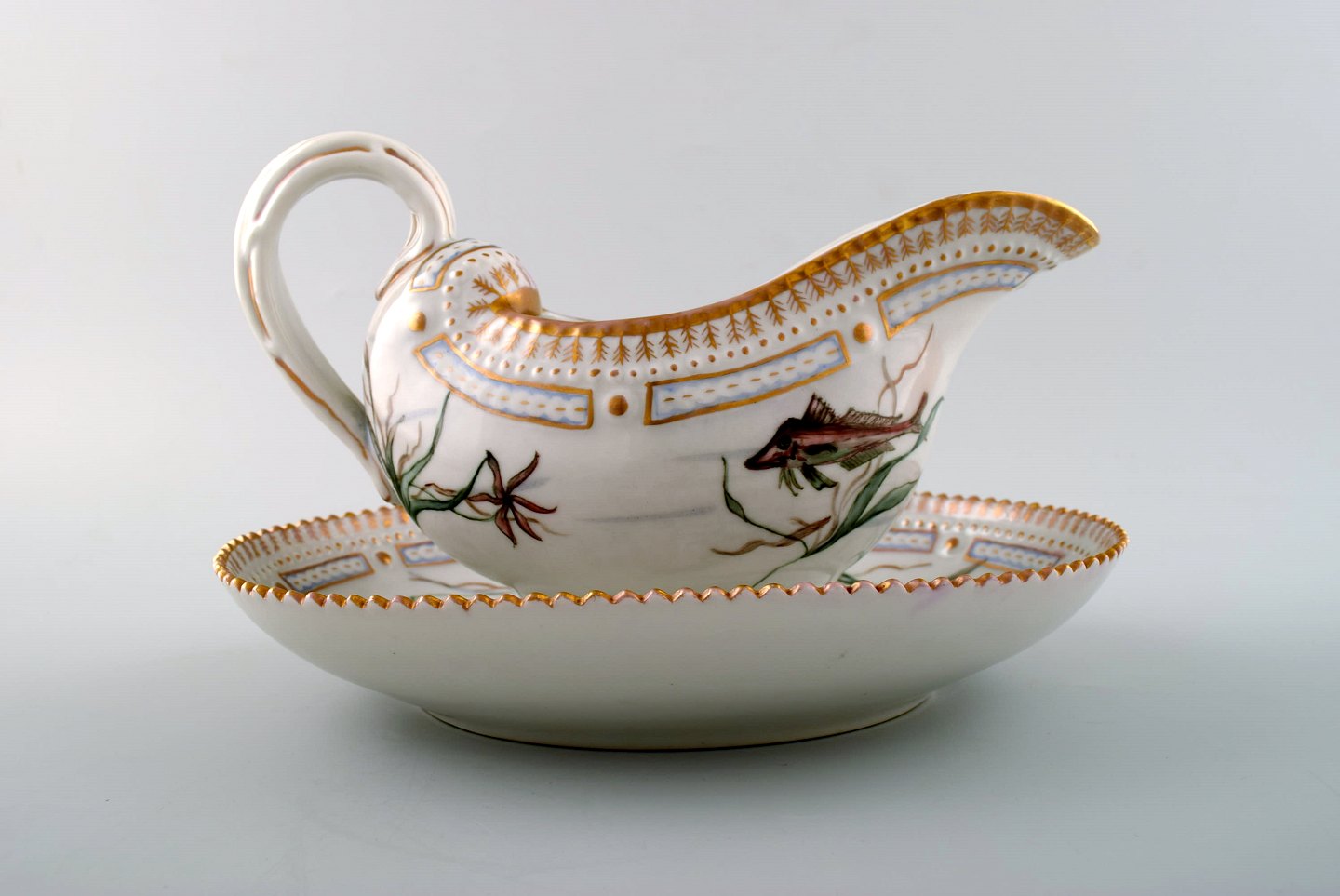 Sjælden Royal Copenhagen Kongelig porcelæn Flora Danica/Fauna danica saucekande/sovsekande, håndmalet med fisk.
