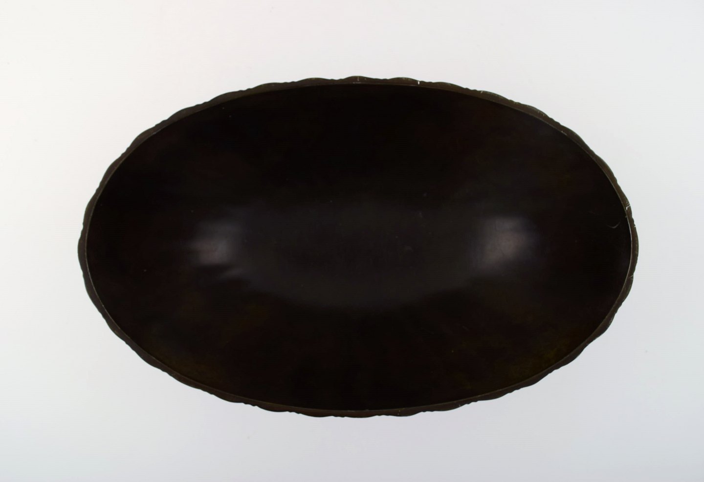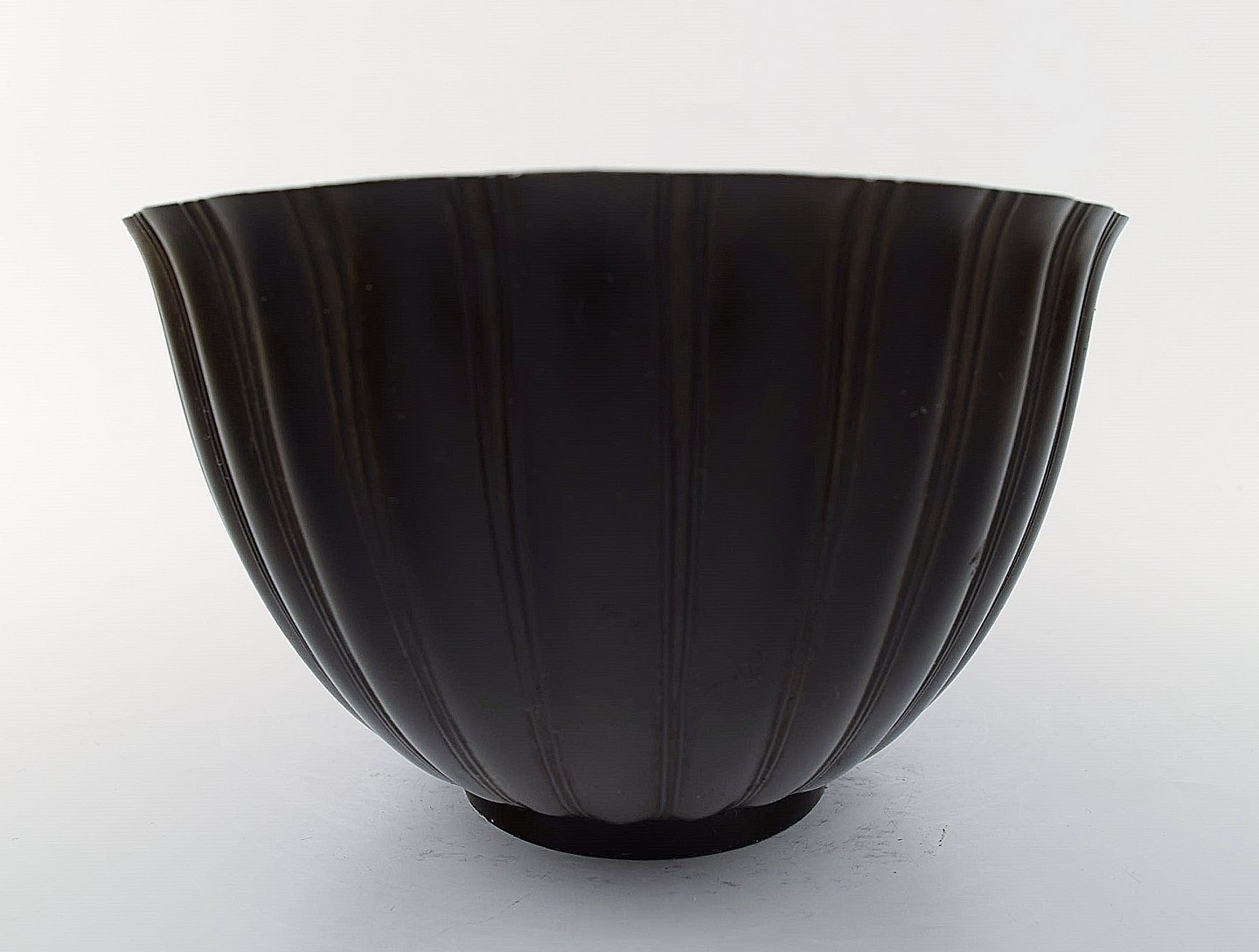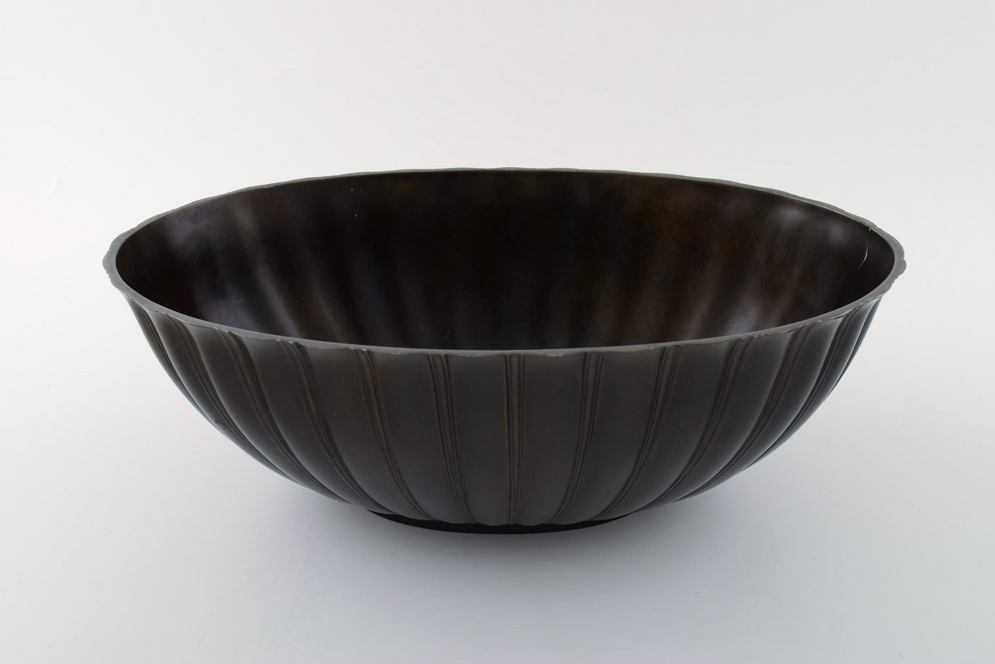 Just Andersen. Jardiniere af patineret diskometal med rillet korpus. Stemplet Just Danmark, nr. 1752.