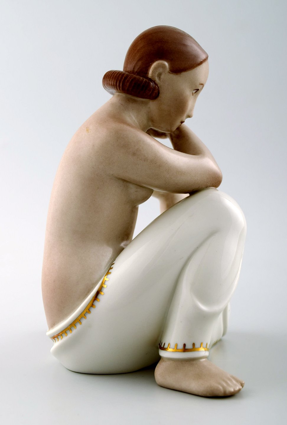Sjælden Arno Malinowski for Royal Copenhagen. Siddende halvnøgen kvinde med art deco frisure. Overglasur. Nummer 12480. Juliane Marie stempel. Højde 13 cm. 1. sortering. I perfekt stand.