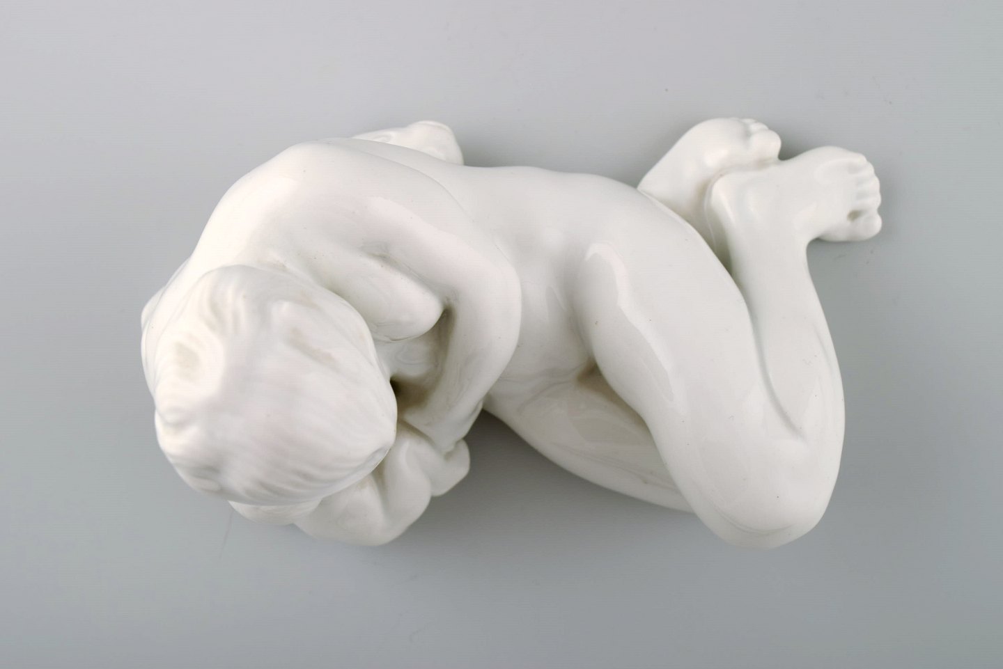 Sjælden Bing & Grøndahl/ B&G, blanc de chine porcelænsfigur af ung nøgen kvinde med barn og fisk af Kai Nielsen.