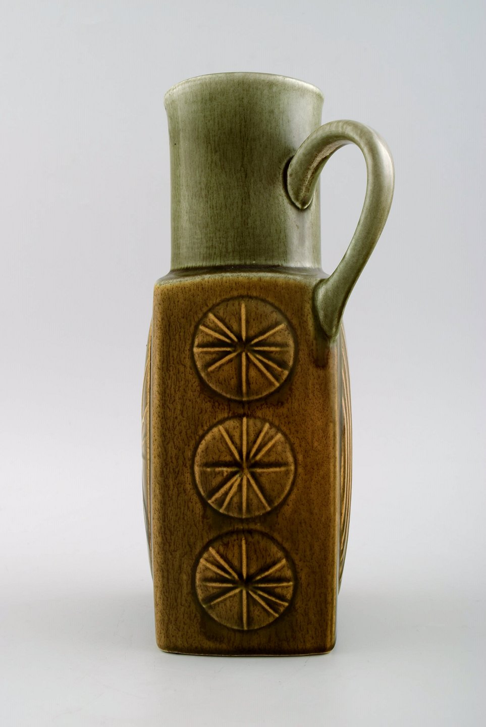 Rörstrand/Rørstrand stor stentøjsflaskevase/kande. Smuk glasur i grønne og brune nuancer. 1960´erne. I perfekt stand. Måler 23 cm. x 7,5 cm.