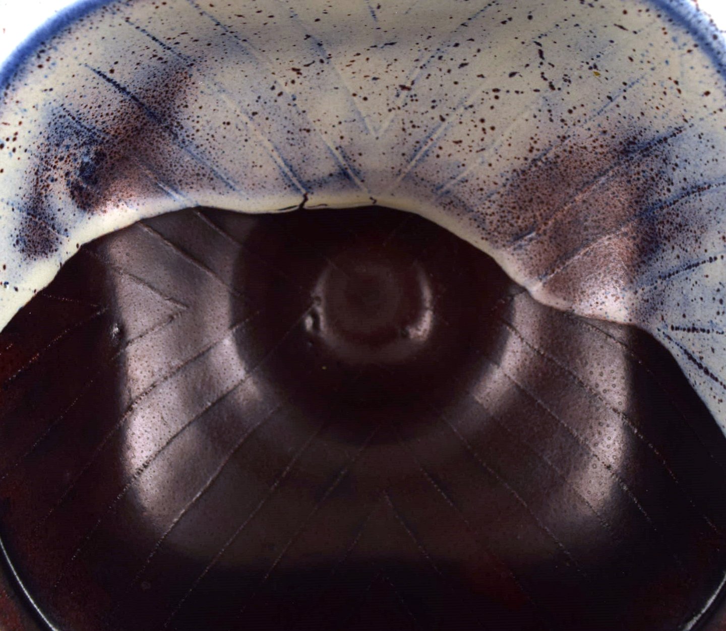 Unika skål af stentøj, dekoreret med lyseblå og bordeaux/mørkerød glasur.