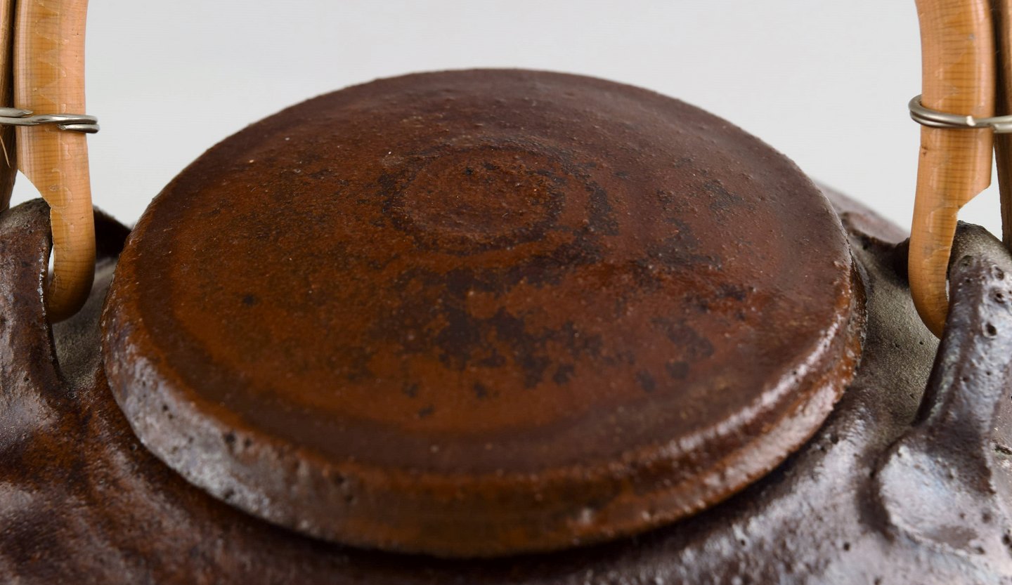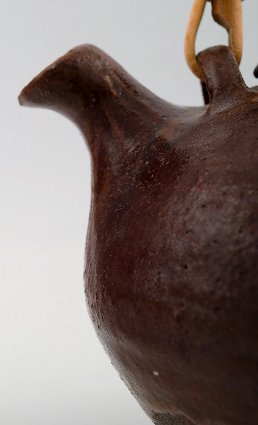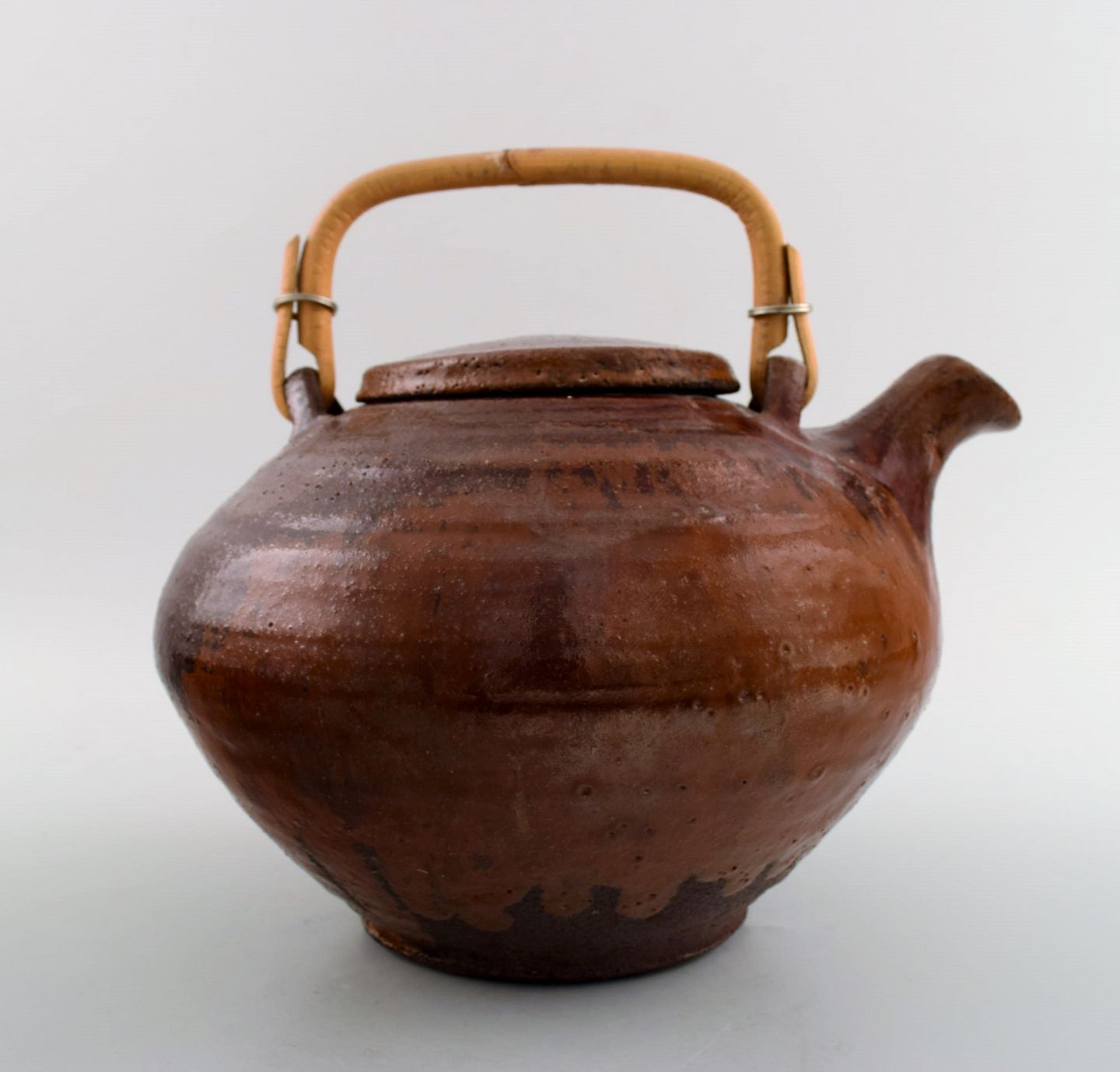 Gutte Eriksen, eget værksted, tekande i keramik. Hank i flet. Stemplet : Gutte. Måler 21 x 21 cm. inkl. hank. I perfekt stand.