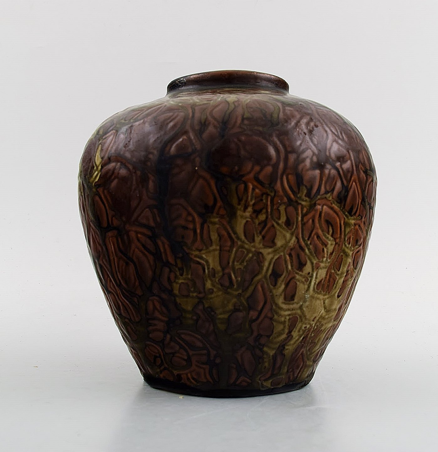 Tidlig Axel Salto for Royal Copenhagen: Vase af stentøj dekoreret med bladværk, sungglasur.