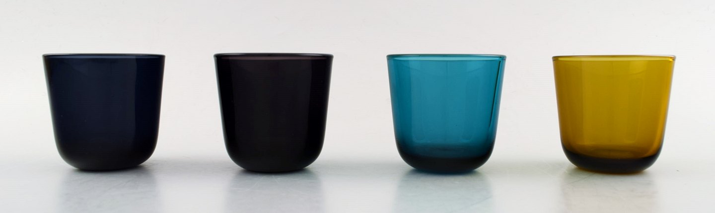 Kaj Franck (Finsk, 1911–1989) Nuutajärvi Glass Works, Finland, kunstglas. 12 vodka/shotglas i forskellige farver. Finland 1960/70´erne. I perfekt stand. Måler : Glas 5,5 cm. x 5,5 cm. Ustemplet.