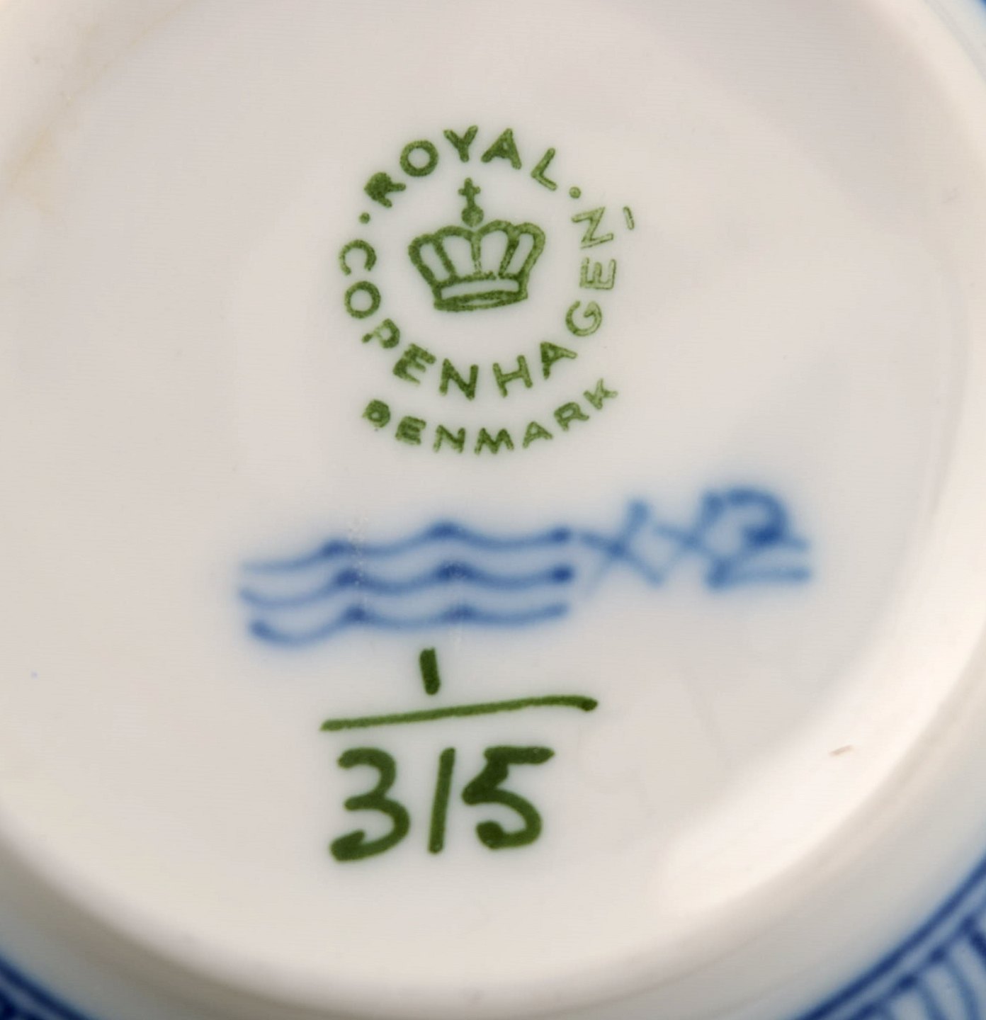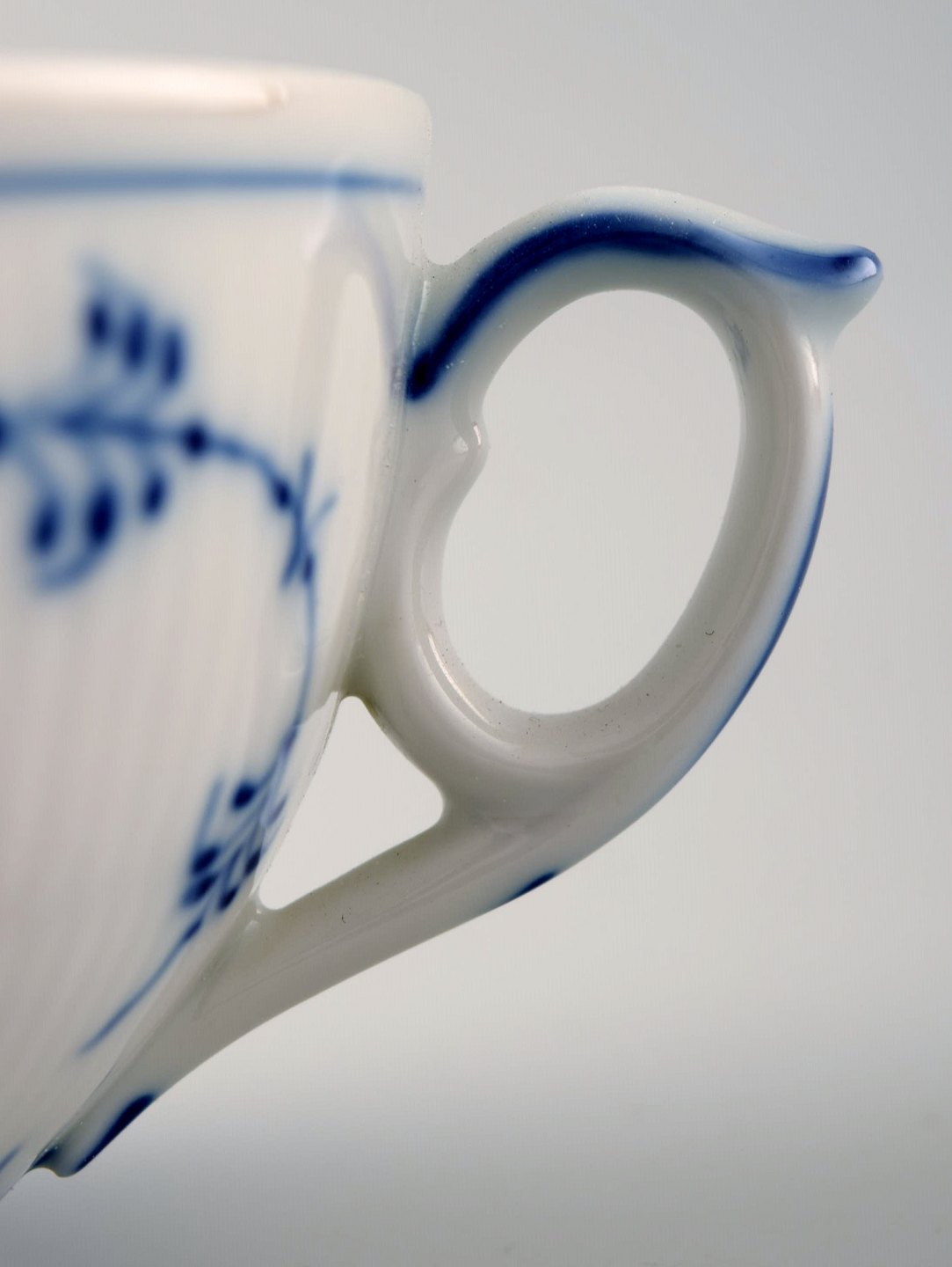 6 par Kgl. Musselmalet riflet Kongelig porcelæn. Royal Copenhagen Musselmalet riflet. Musselmalet stor thekop nr. 315. Højde 5,6 cm. Diameter 10,5 cm. 1. sortering, i perfekt stand. 2 sæt i anden sort.