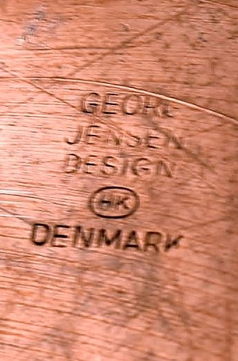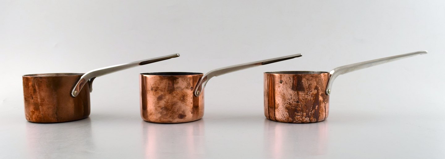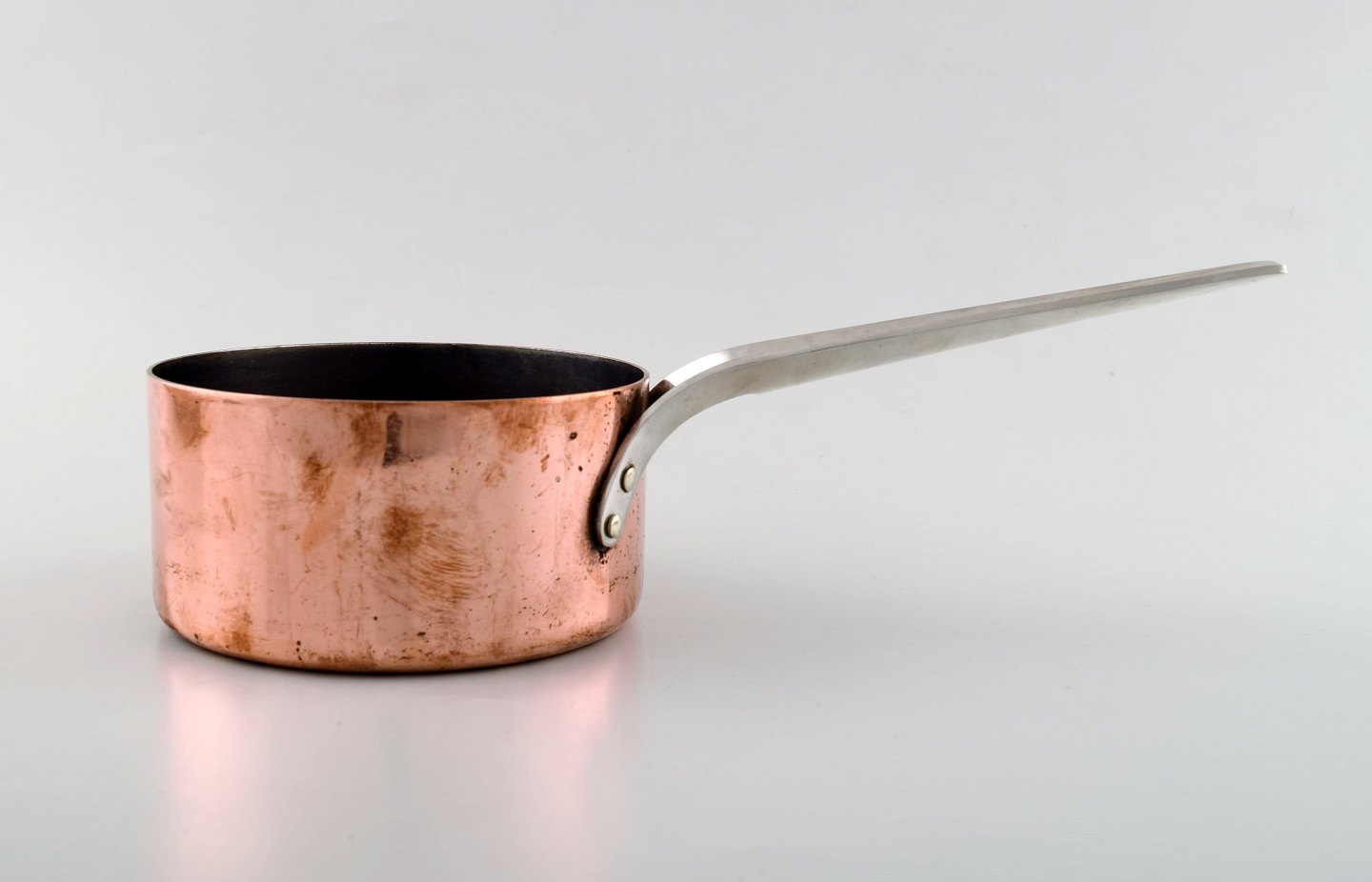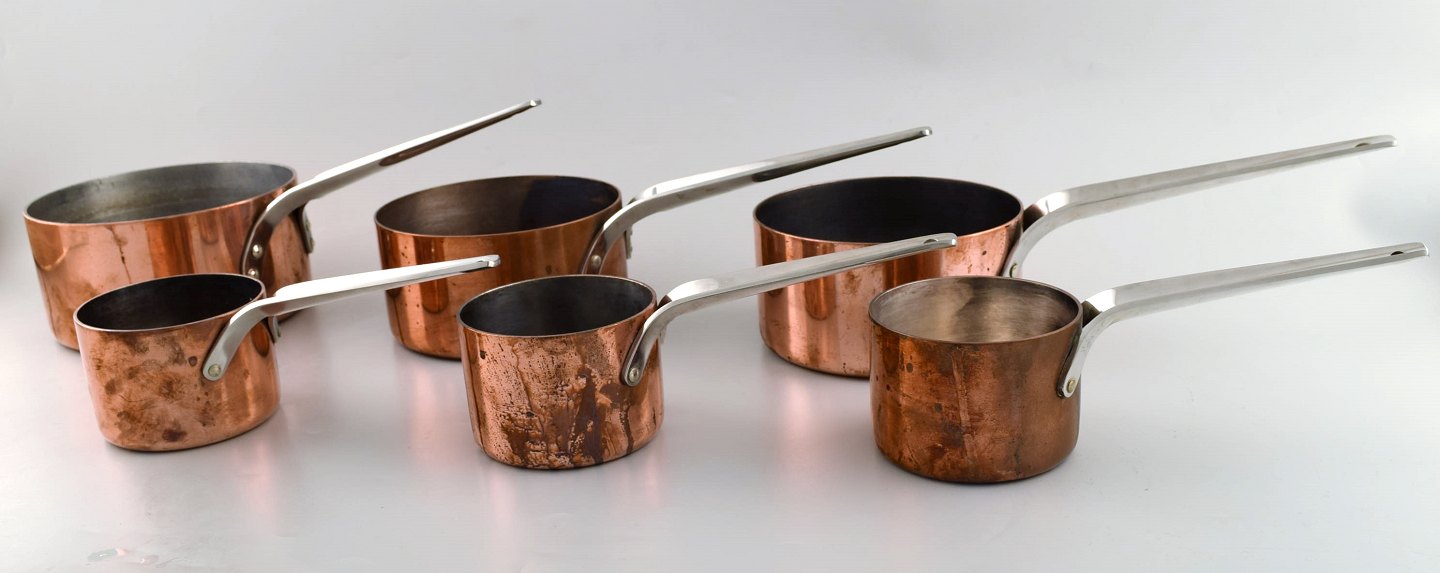 Henning Koppel for Georg Jensen: "Taverna". Seks gryder af kobber, indersider belagt med sølv. Skafter af stål.