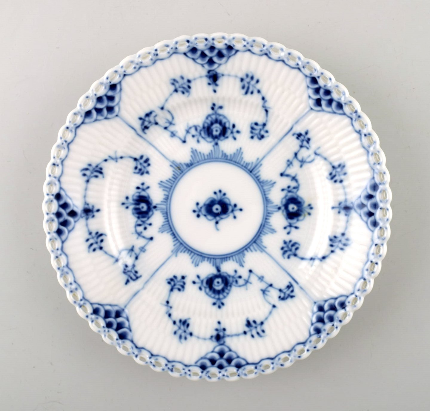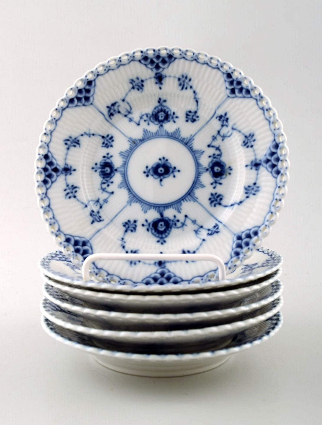 Seks stk. musselmalet, helblonde flad desserttallerkener fra Royal Copenhagen.