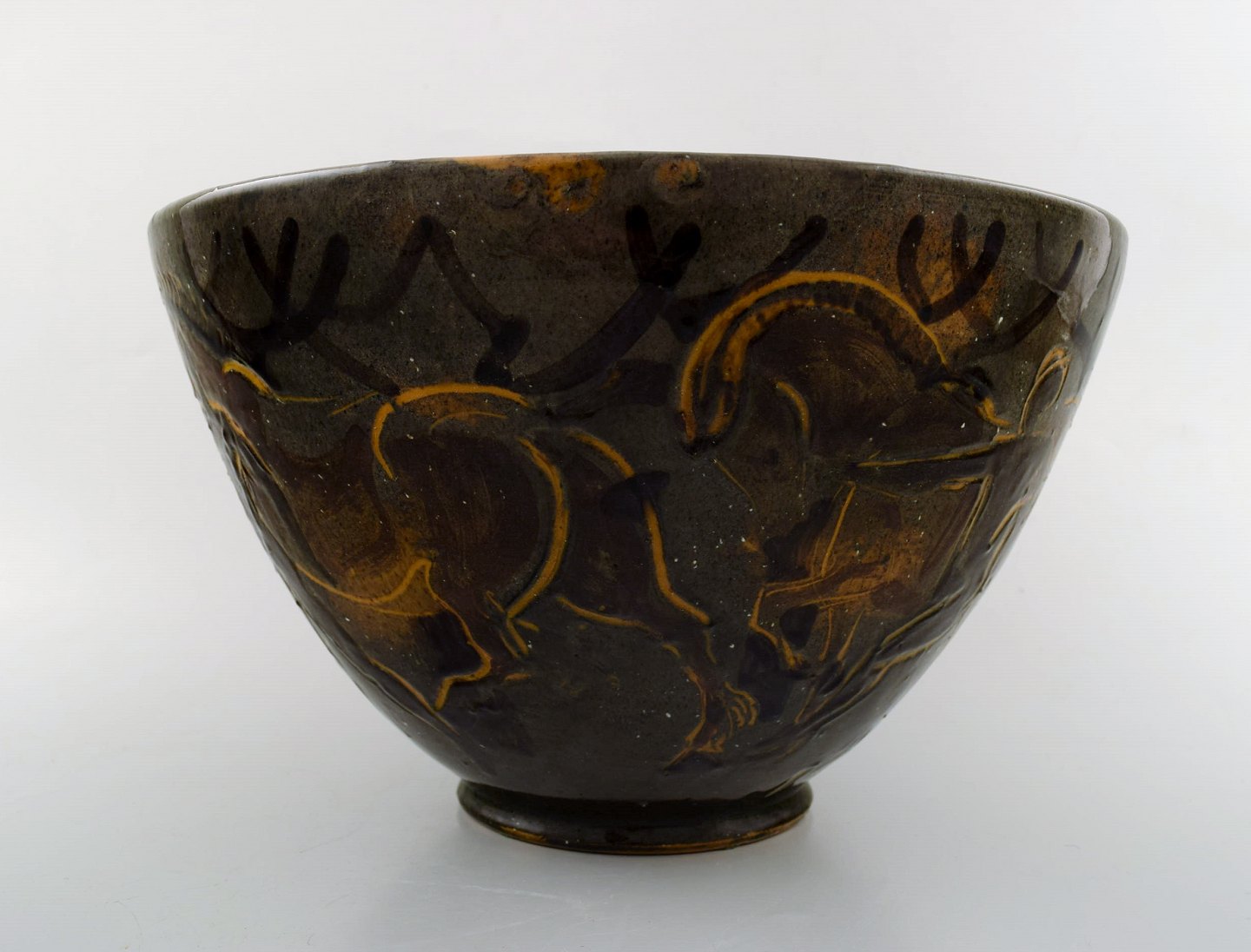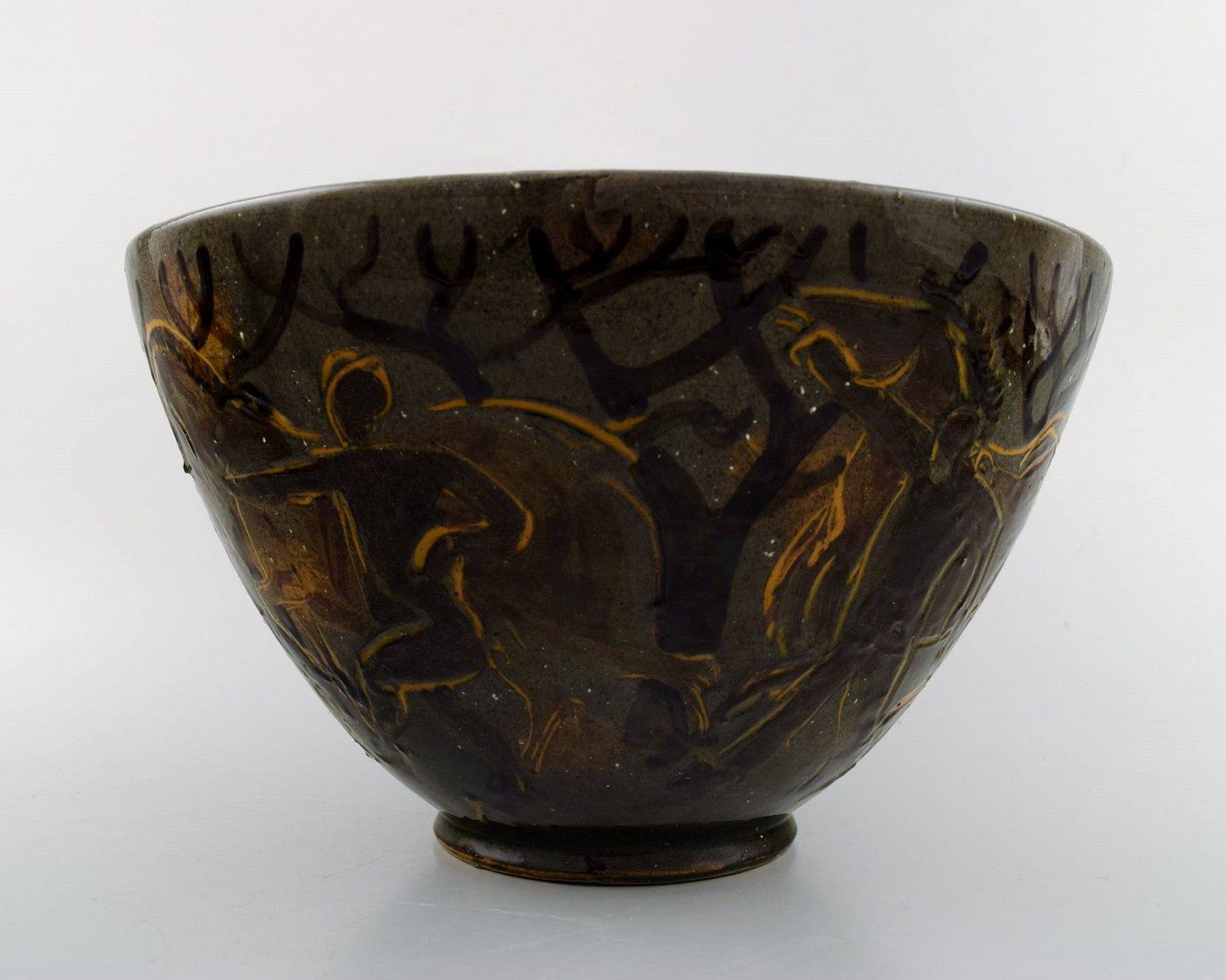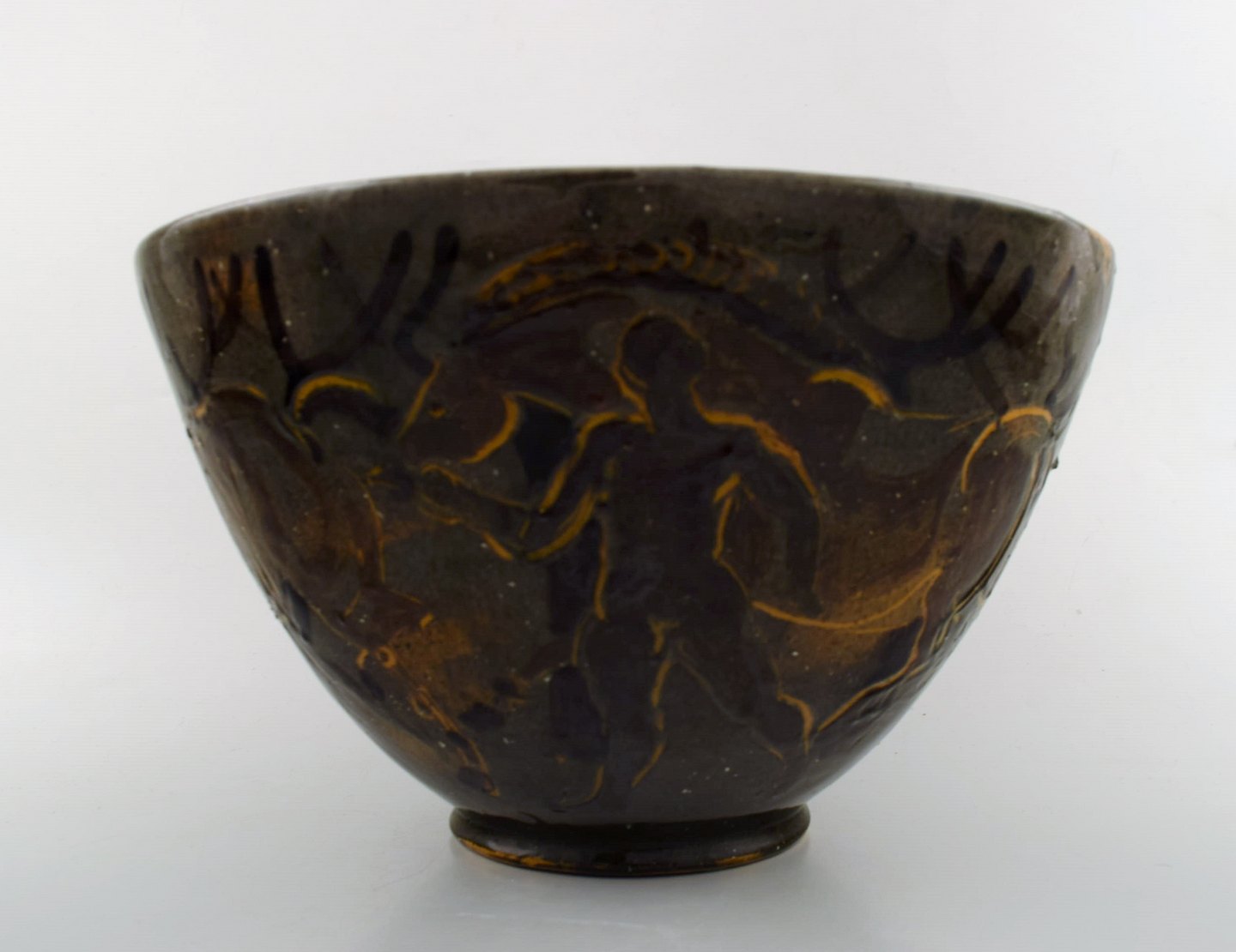 Unika Helge Daner Jensen for Kähler. Keramikskål dekoreret med mænd og heste, ca. 1920´erne.