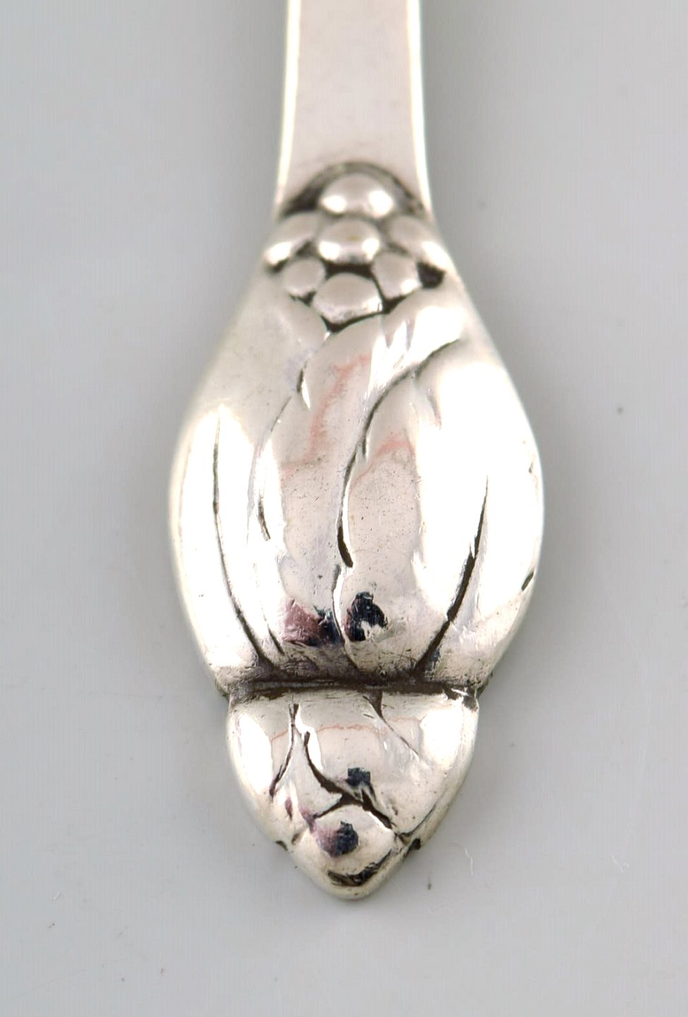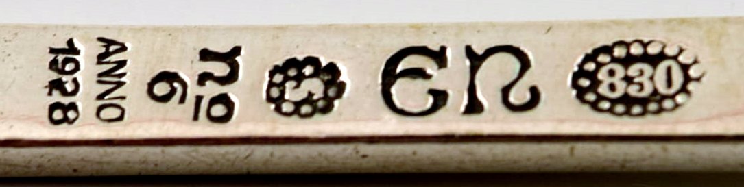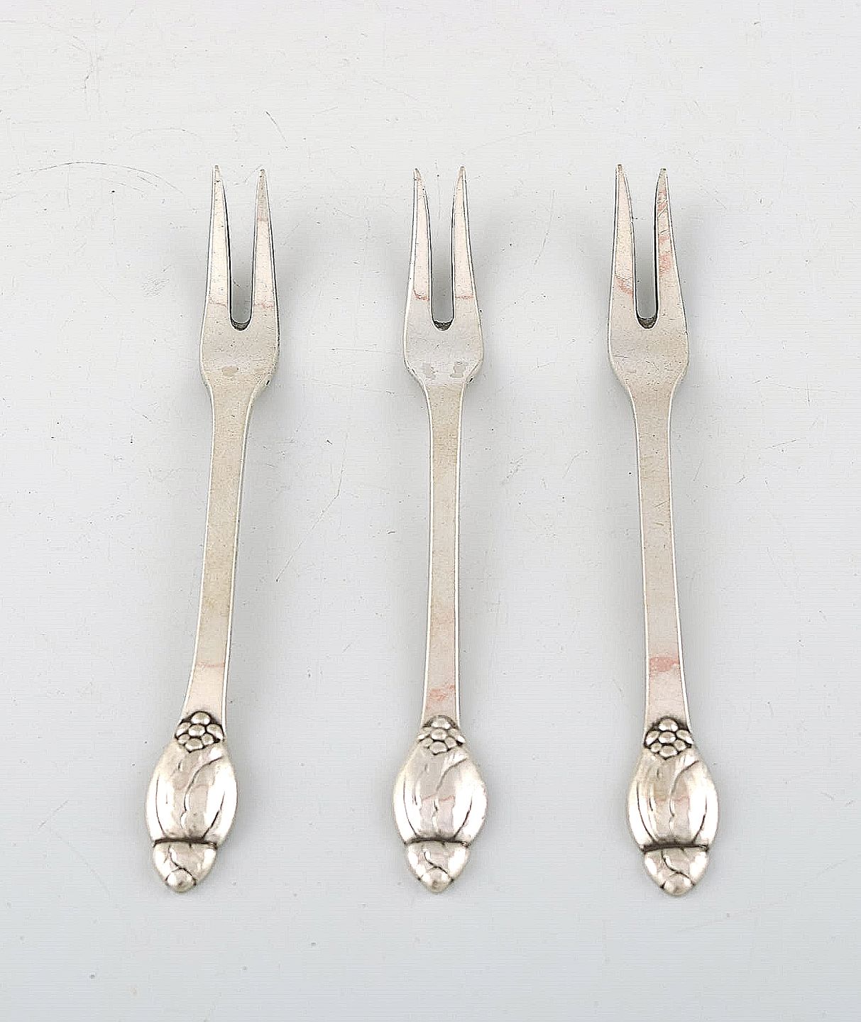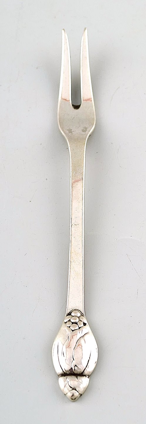 Evald Nielsen nummer 6, tre pålægsgafler i sølv. Måler 11,8 cm. Stemplet. I perfekt stand.