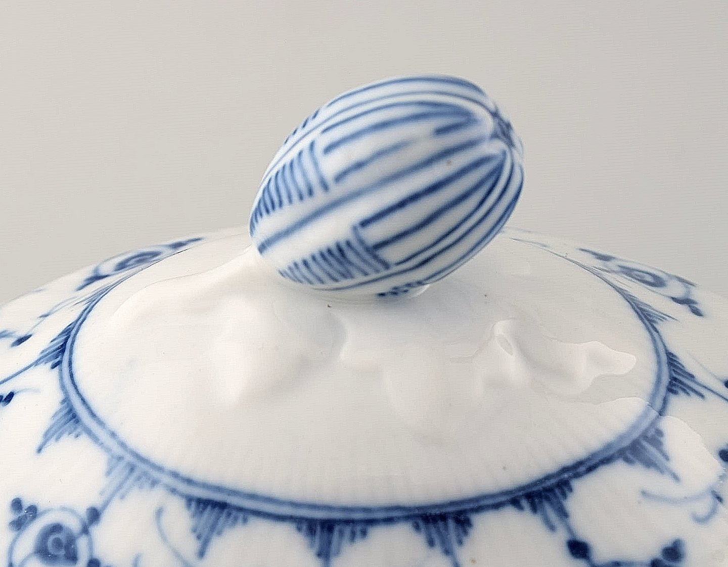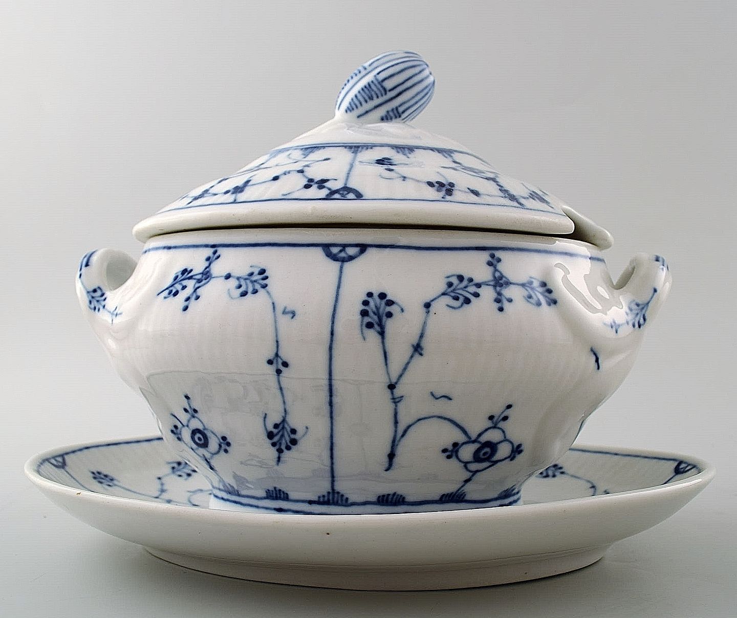 Sjælden og antik Bing & Grøndahl, B&G musselmalet sovseskål med låg. 1870´erne. Måler : 22 x 17 cm. Tidligt stempel. 1. sortering, i perfekt stand.