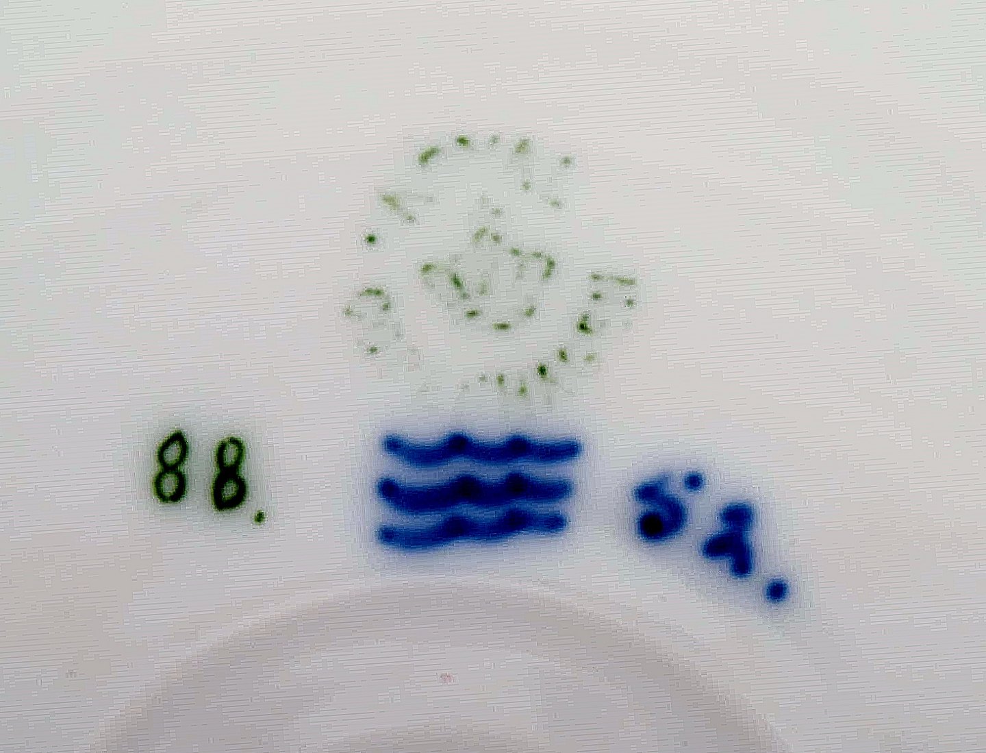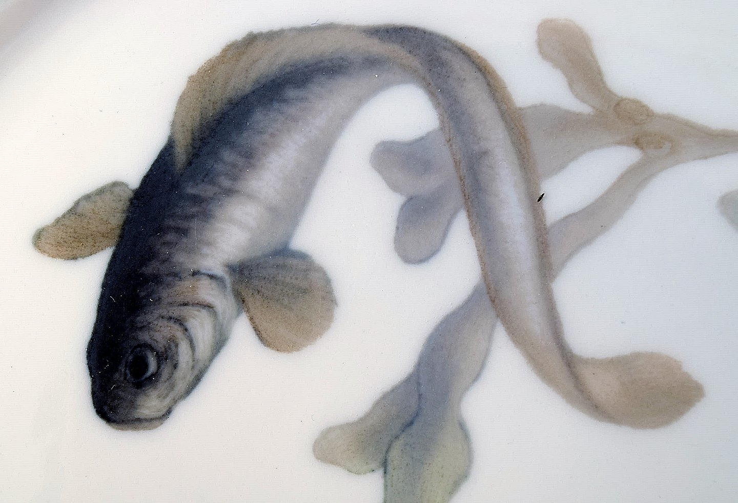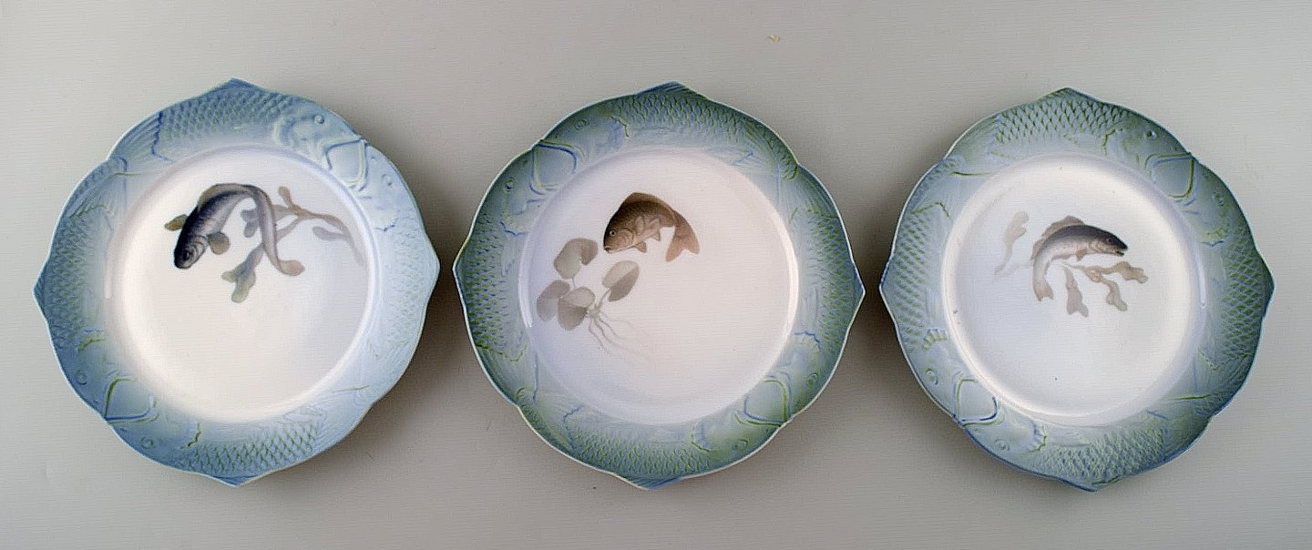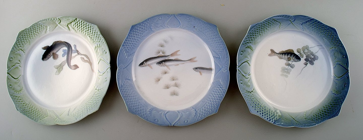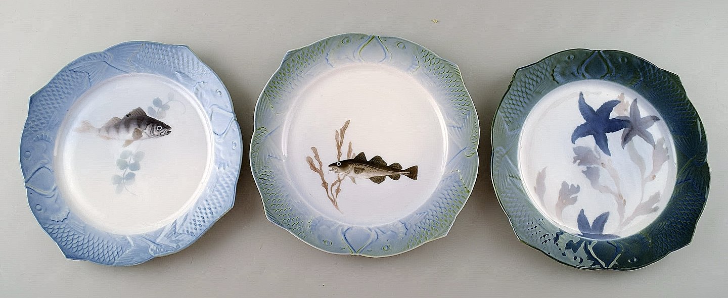 Arnold Krog for Royal Copenhagen : "Fiskestel" af porcelæn, Ni tallerkener dekoreret i farver med forskellige fisk. Nummer 117/3002. Måler : 23,5 cm. 2. sortering, i perfekt stand.