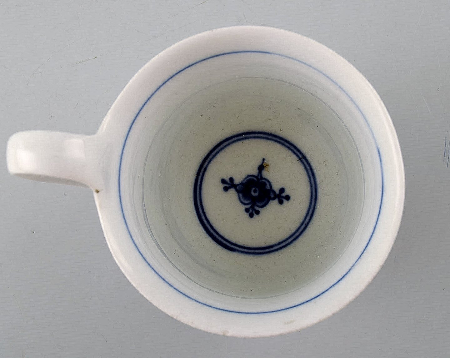 Musselmalet riflet kaffekop med høj hank fra Royal Copenhagen. Dekorationsnummer 1/74. Måler : 10 cm. x 8,5 cm. 1. sortering. I perfekt stand.