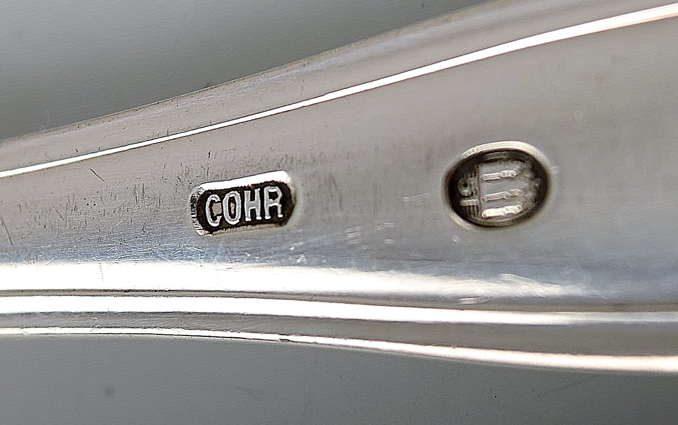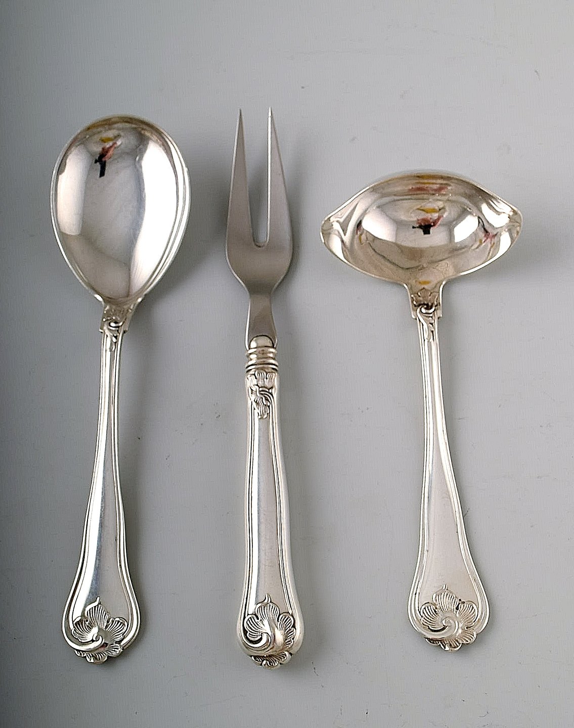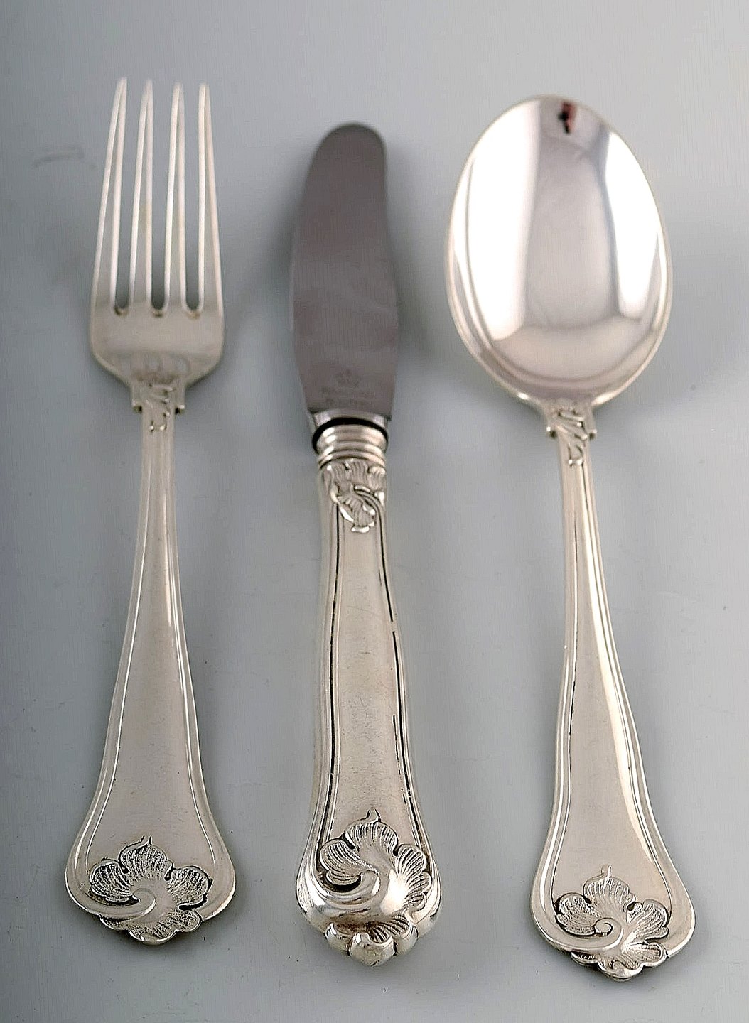 Carl M. Cohr. 'Saksisk Blomst. Komplet 3 tårnet middagsservice til 6 p. I alt 21 dele. Middagskniv/gaffel og suppeske samt sovseske, kødgaffel og serveringsske. Kniv måler 22 cm. Stemplet. I flot stand.