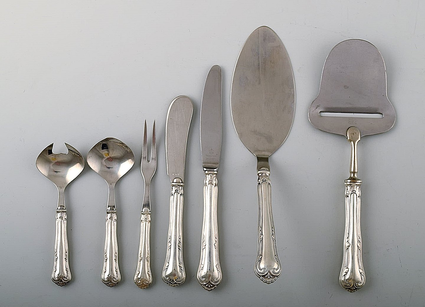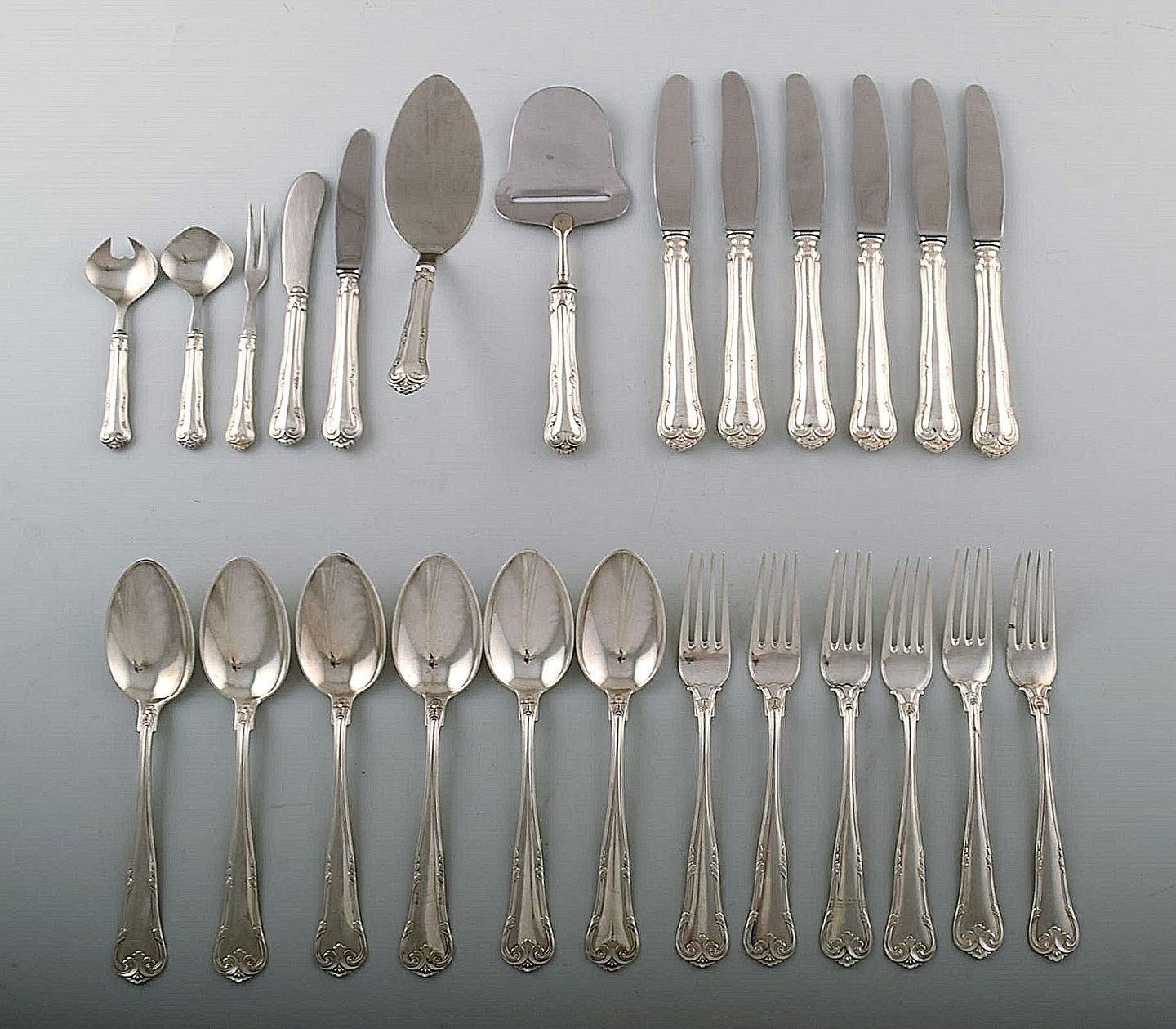 Dinner knife / fork and soup spoon, cheese slicer, herring fork, butter knife, fruit knife and a small salad set.
