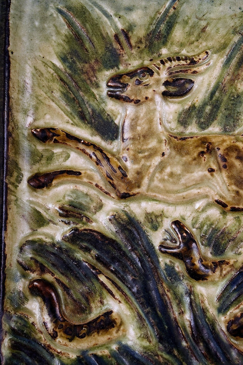 Royal Copenhagen stentøjsrelief med springende hjort og aggresiv slange.