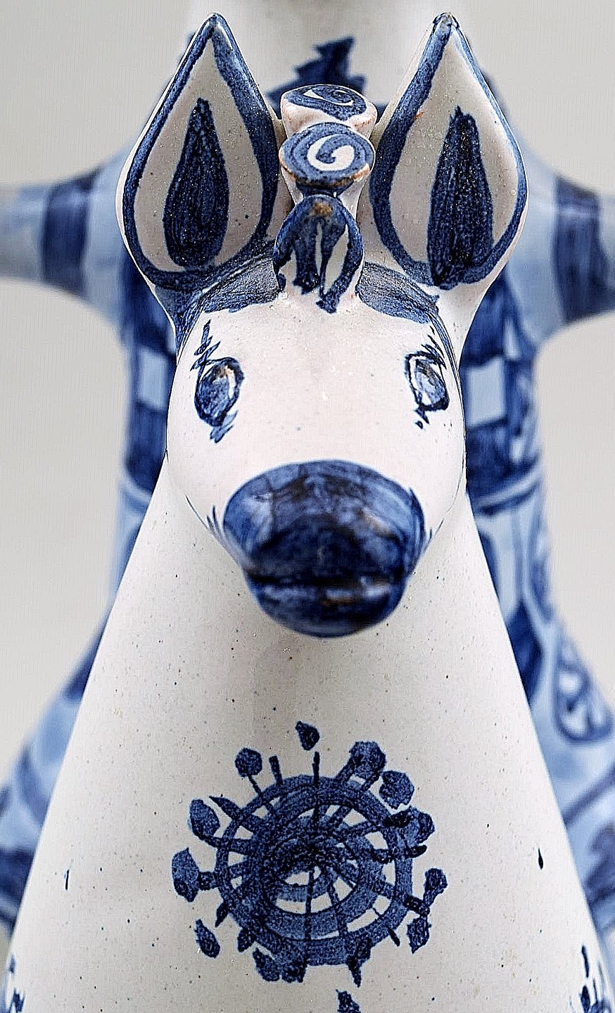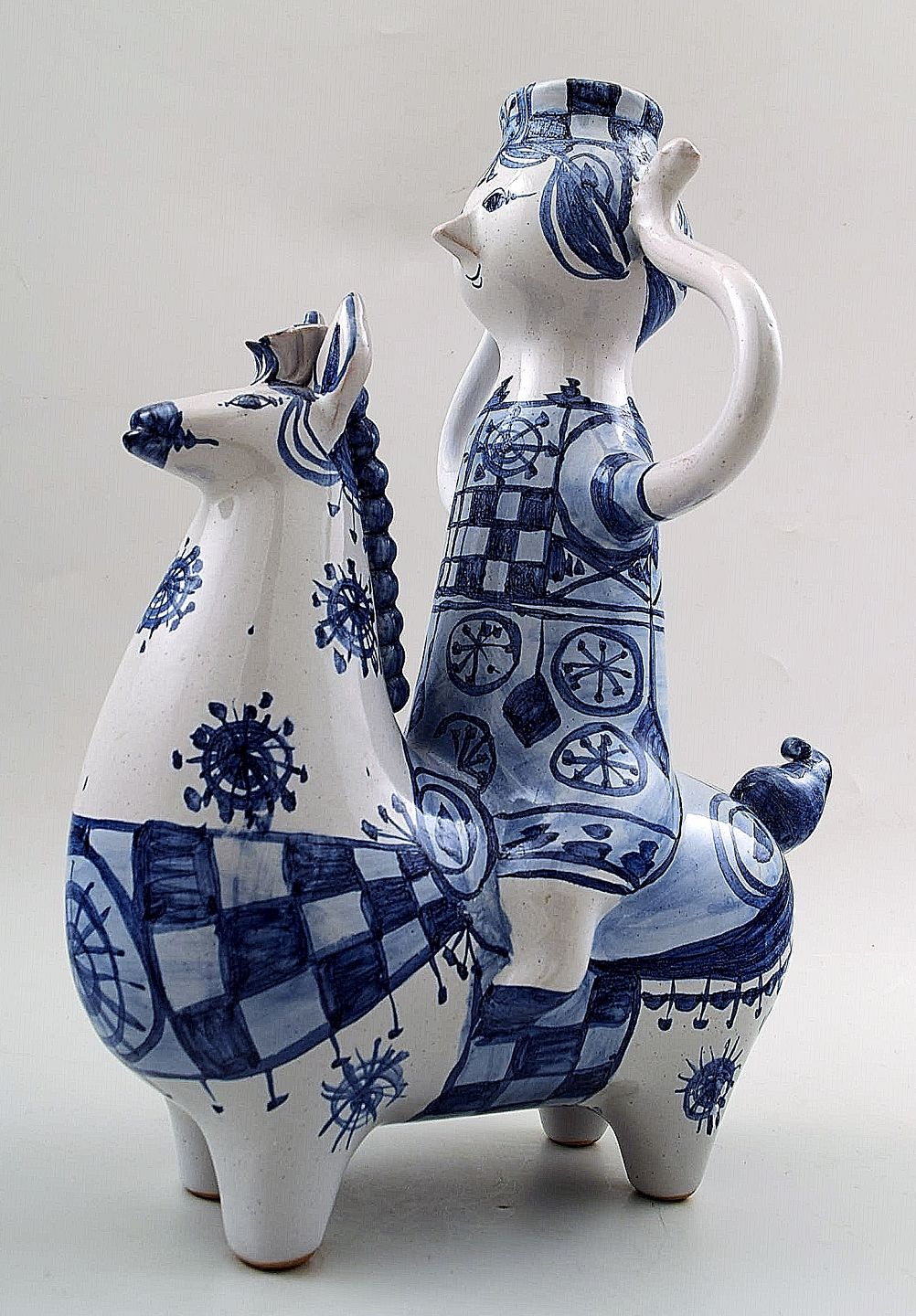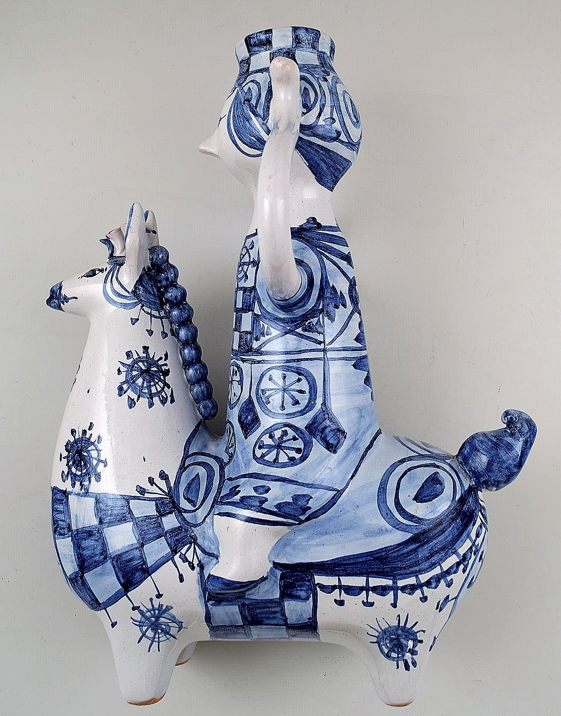 Sjælden Bjørn Wiinblad keramikfigur fra det blå hus. Figur / lysestage rytter til hest med plads til et lys. Dekorationsnummer L25. Denne er fra 1969. Højde 26 cm., bredde 20 cm. Perfekt stand.