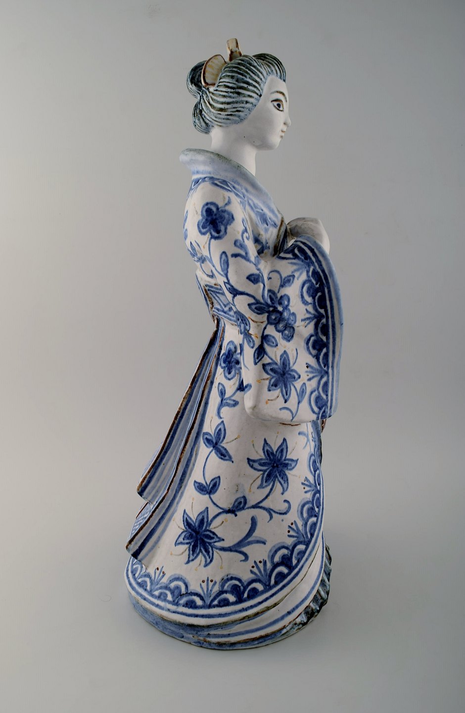 Very large and rare Hjorth (Bornholm) glazed stoneware figure, Japanese by Gertrud Kudielka. Bought on Bornholm in 1961. Fine glaze in shades of blue. Measures: 52 cm. high. 24 cm. wide. Signed Hjorth and GK.