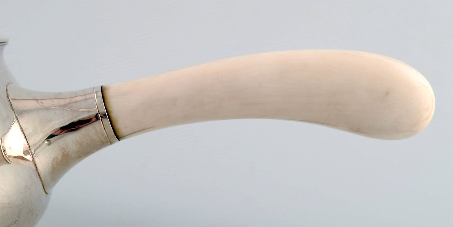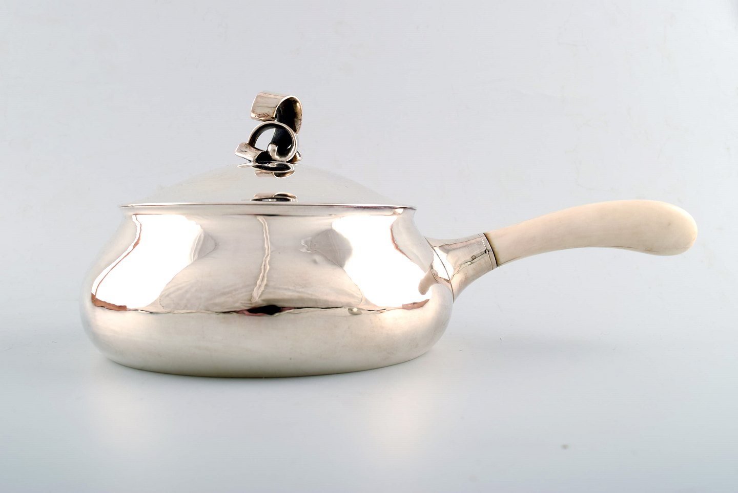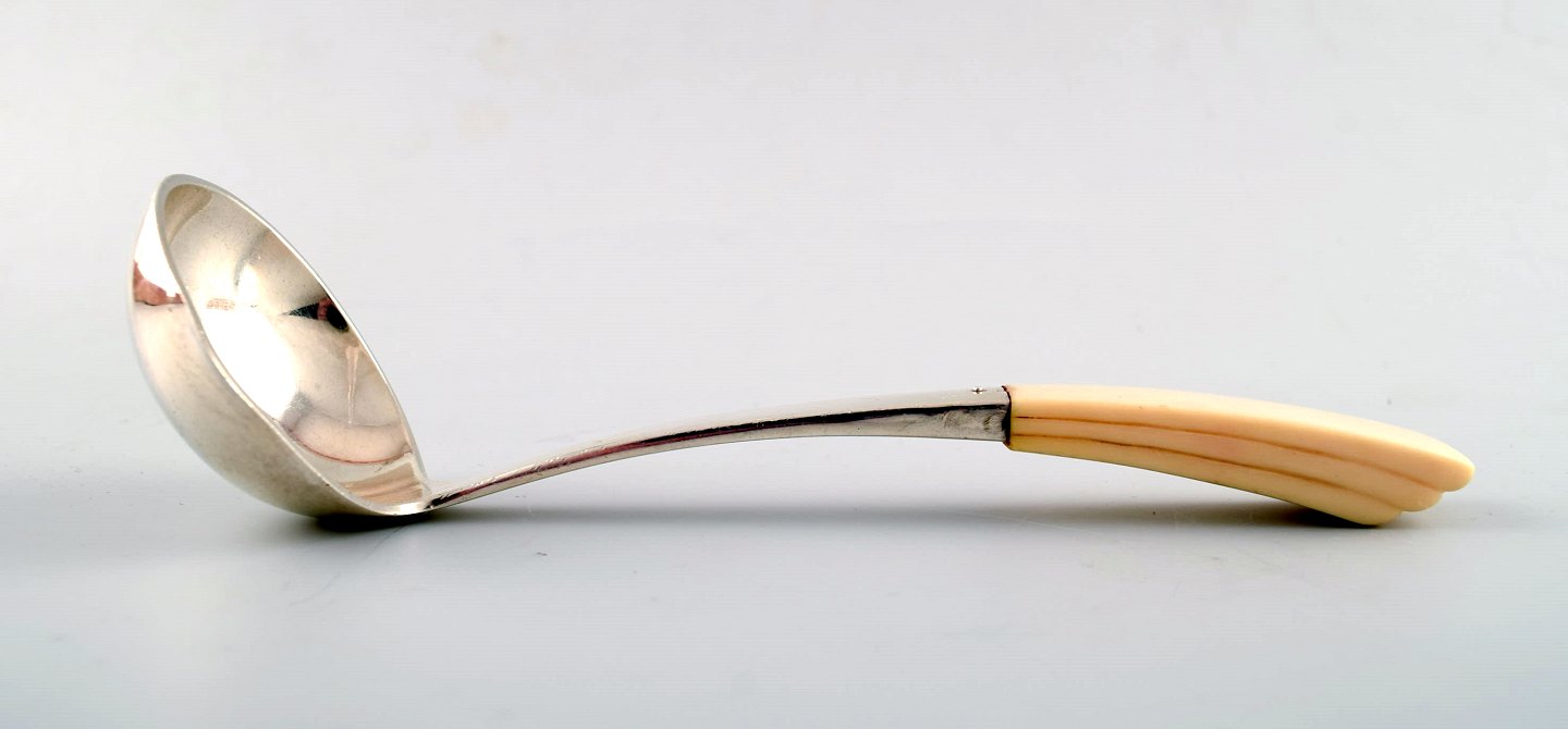 Evald Nielsen: Et par serveringslågskåle samt en sauceske af sterlingsølv. Stjerthanke og skaft af elfenben.