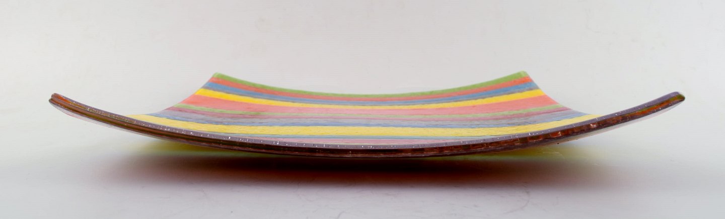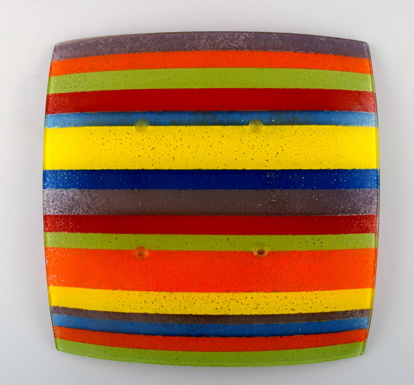 Rosenthal art glass dish in striped design. Unsigned. Measures: 28 cm. x 28 cm. In perfect condition.