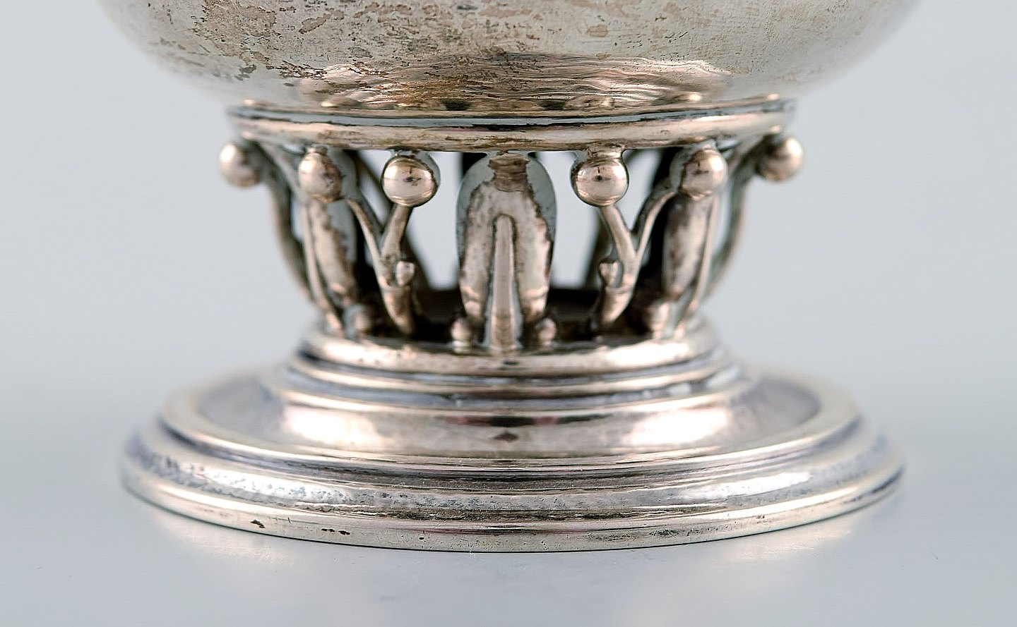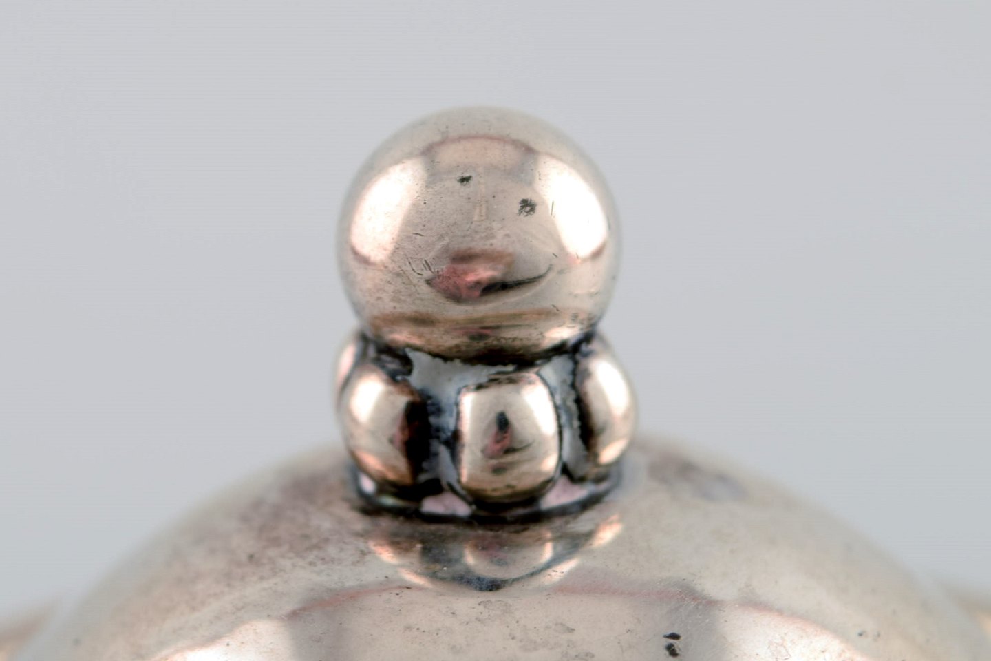 Georg Jensen : Tidlig sennepskrukke af sølv med indsats af facetslebet klart glas, med tilhørende ske.