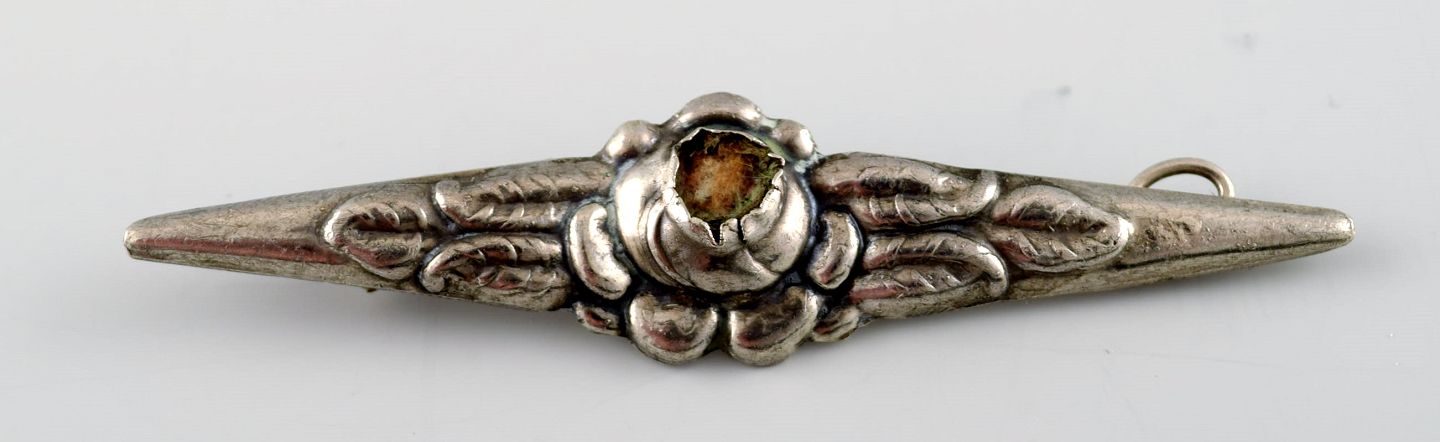 Dansk skønvirkebroche i sølv. Tidligt 1900 tallet. Stemplet. Måler : 67 mm. I god stand. Stor samling skønvirkebrocher haves.