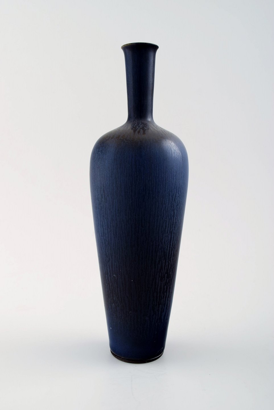 Friberg studiohand ceramic vase, unique. Fantastic glaze in deep blue shades. Marked. 1960s. Perfect. 1st. assortment. Measures: 20 cm. x 7 cm.