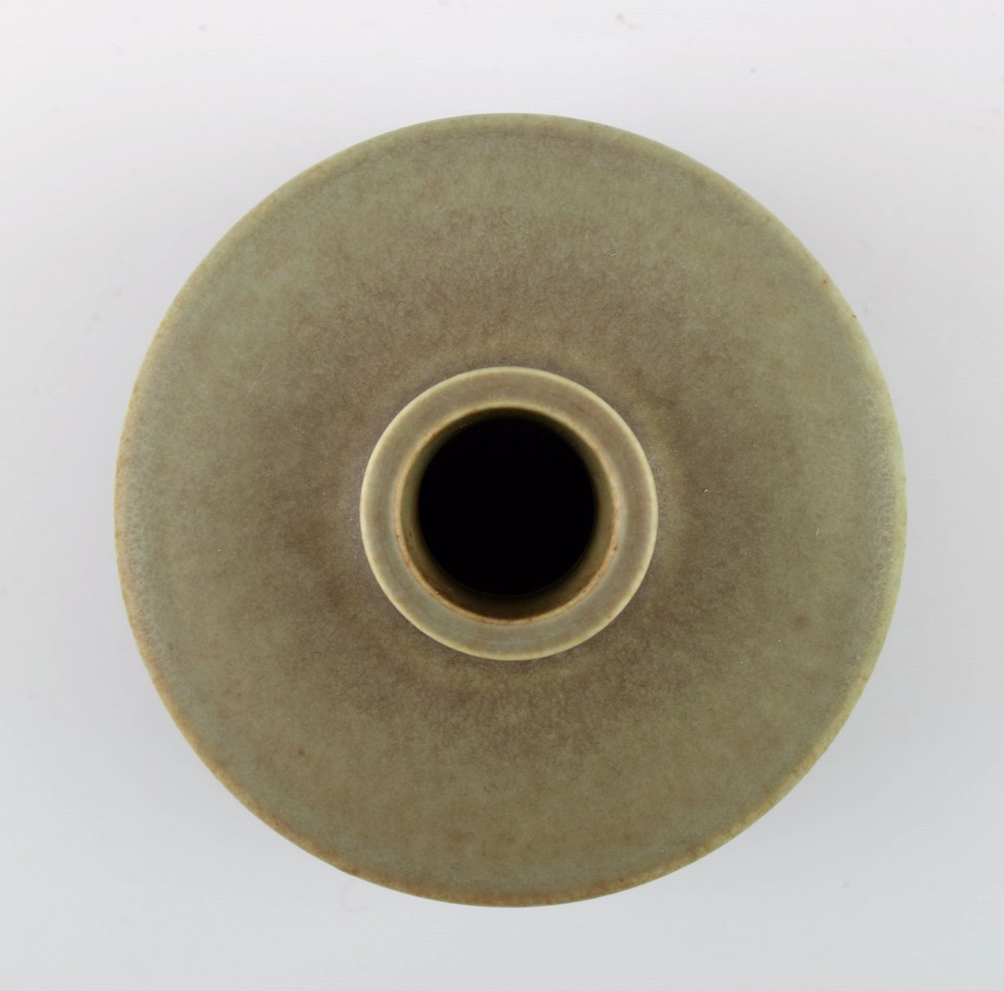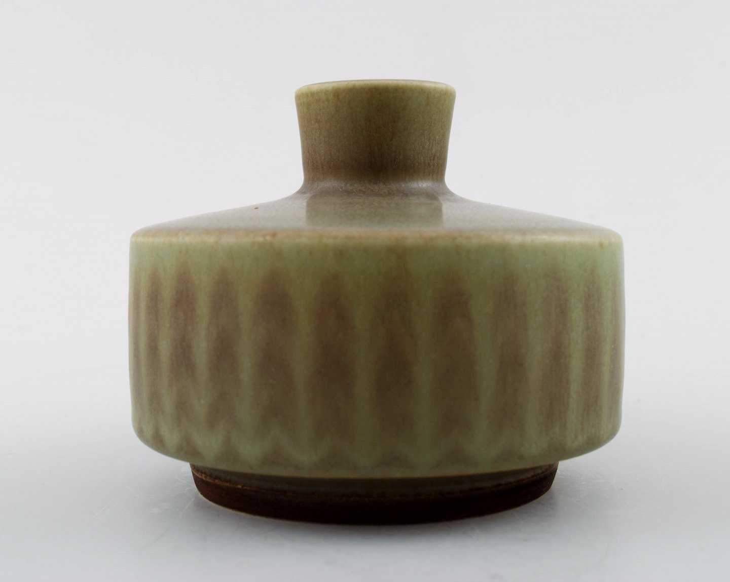 Berndt Friberg Studio ceramic vase. Modern Swedish design. Unique, handmade. Rare form. Beautiful glaze in greenbrown shades. Perfect condition. 1st. factory quality. Measures: 9,5 x 8,5 cm.