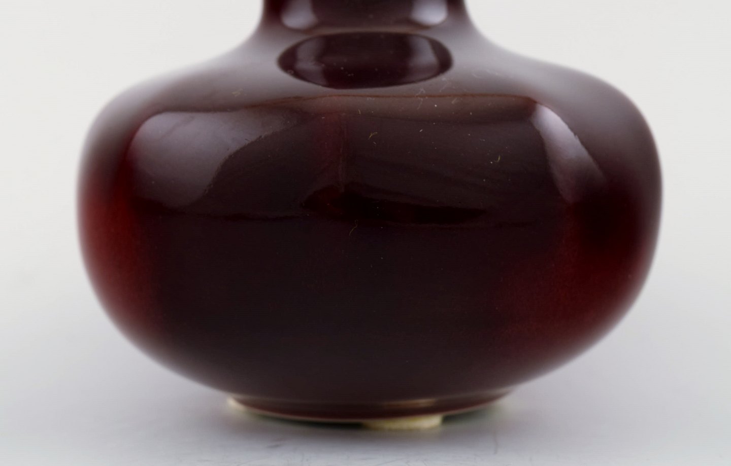 Rare Lisbeth Munch Petersen porcelain vase, Bing & Grondahl. Narrow neck. Denmark mid 20 c. Oxblood glaze. Measures: 13 x 12 cm. Stamped. In perfect condition, 1st. Assortment.