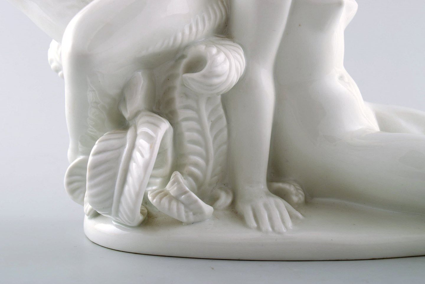 Harald Salomon for Rörstrand, hvidglaseret Art deco figur forestillende nøgen kvinde og fløjtespillende pan. Stemplet. I perfekt stand. Måler : 25 cm. x 25 cm.