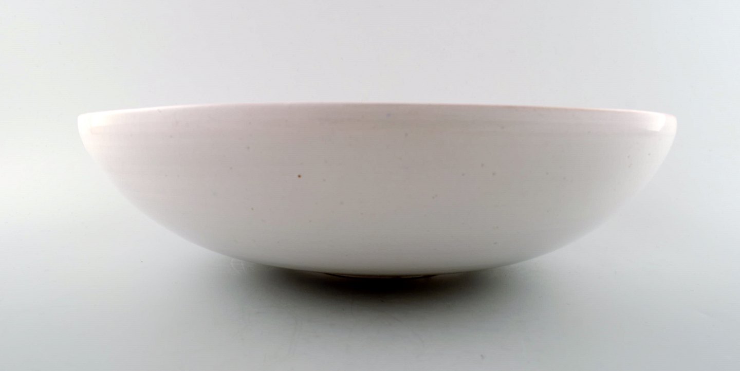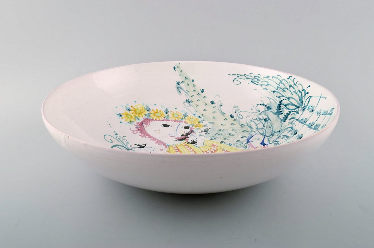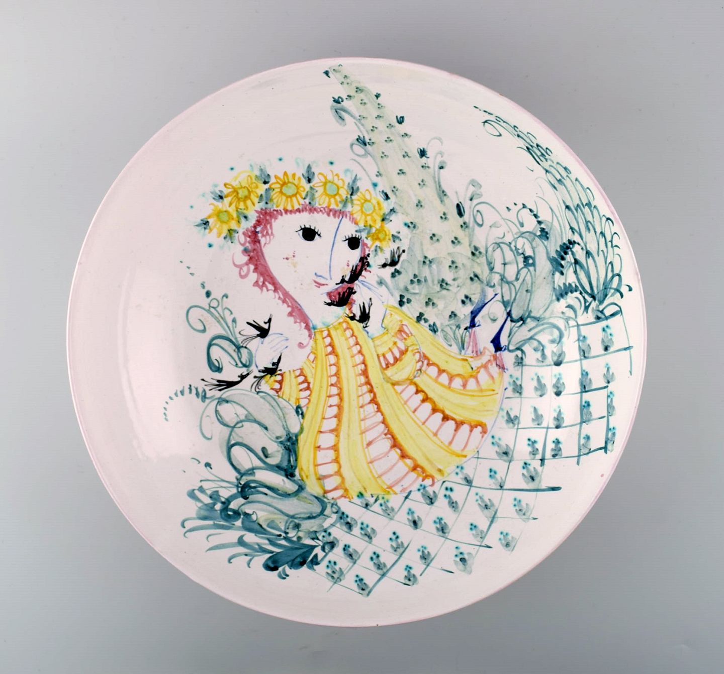 Bjørn Wiinblad, eget værksted: Sjælden og tidlig unika stor rund skål dekoreret med kvinde med blomster i håret i haven, Bjørn Wiinblad 50. Diameter : 30,5 cm. x 9 cm. dybt. I perfekt stand. Signeret 1950.