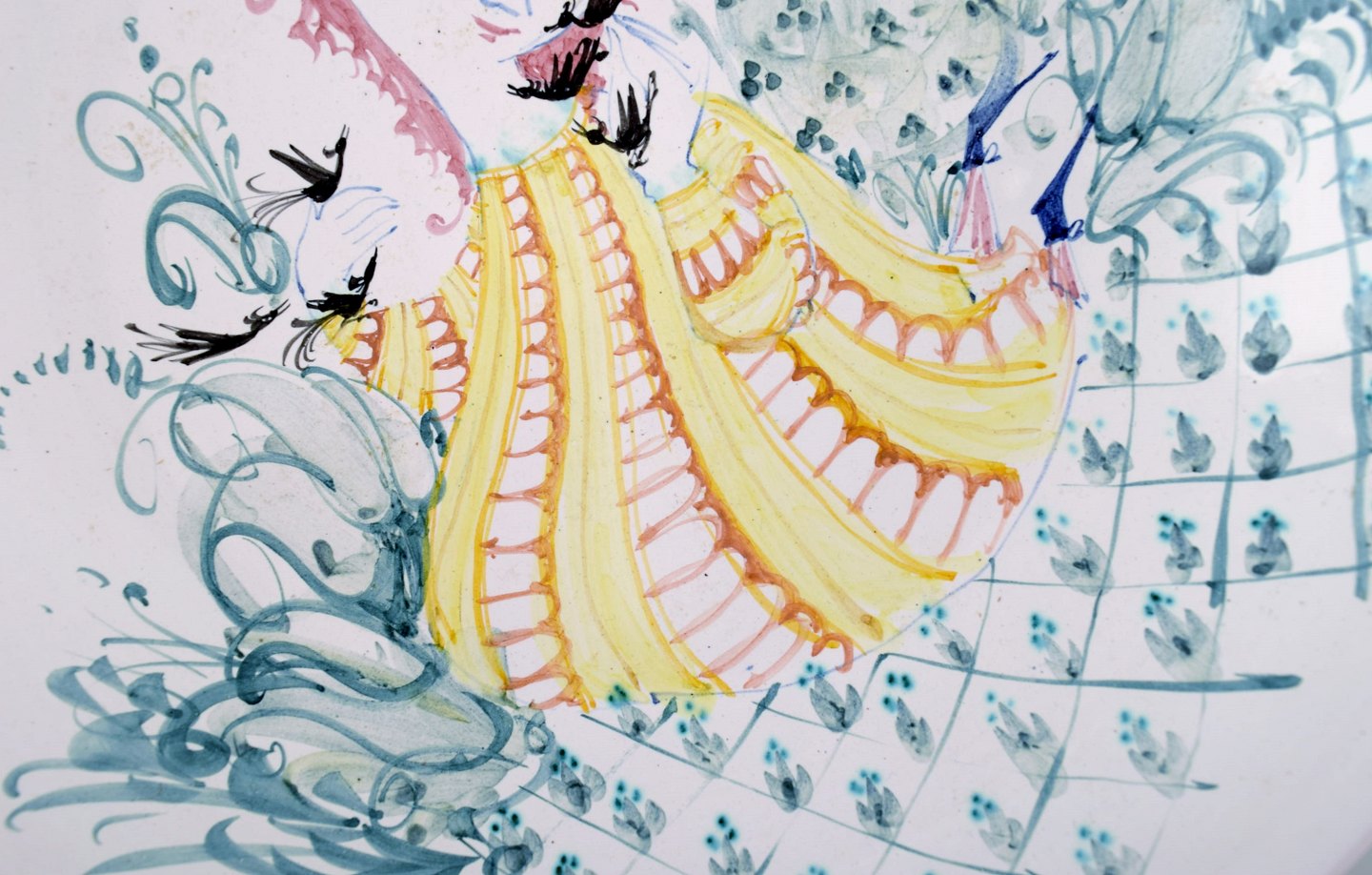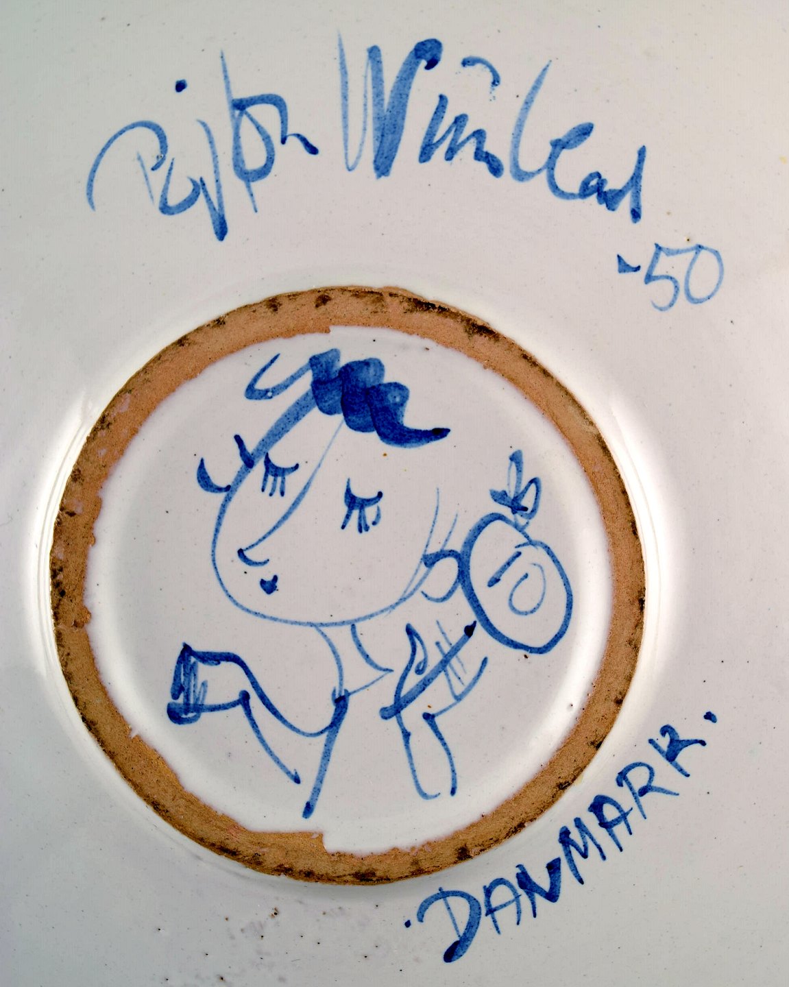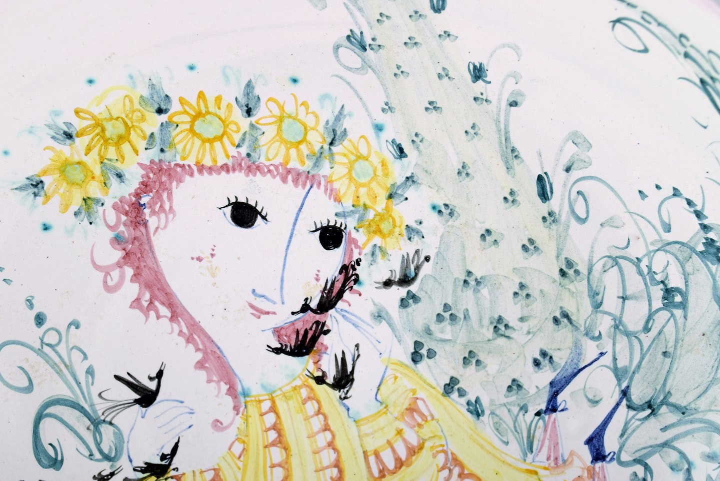 Bjørn Wiinblad, eget værksted: Sjælden og tidlig unika stor rund skål dekoreret med kvinde med blomster i håret i haven, Bjørn Wiinblad 50. Diameter : 30,5 cm. x 9 cm. dybt. I perfekt stand. Signeret 1950.