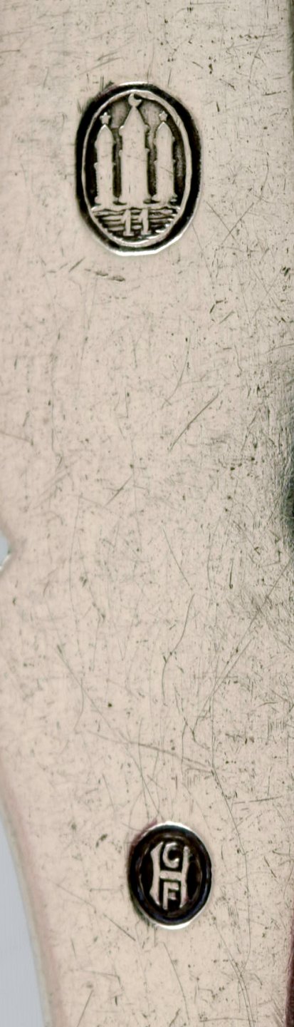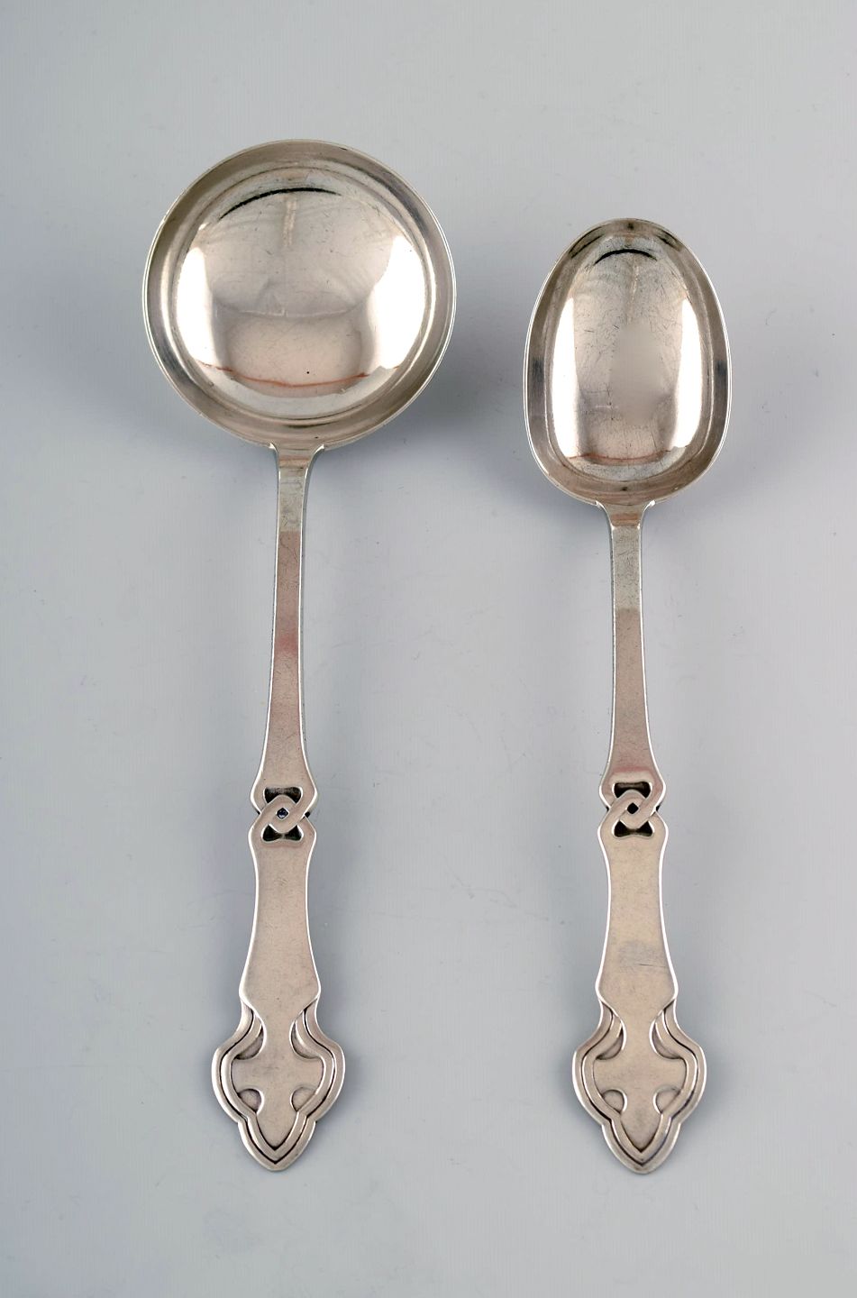 Dansk skønvirke to serveringsskeer, tretårnet. 1910/20´erne. Guardein : CHF. Christian. Fr. Heise. Måler : største 22,5 cm. I flot stand.