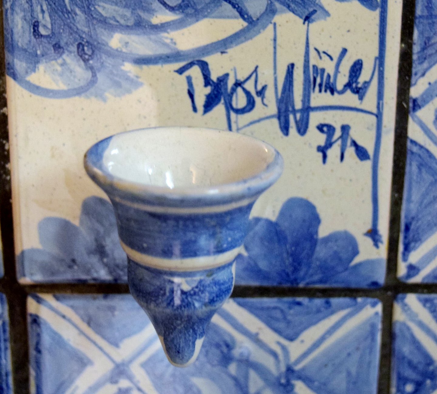Bjørn Wiinblad (1918-2006). Kolossalt ottekantet unika væglysestage/relief med tre lysarme udført i blåglaseret keramiske kakler, dekoreret med kvinde og fugl omkranset af geometrisk ornamentik.