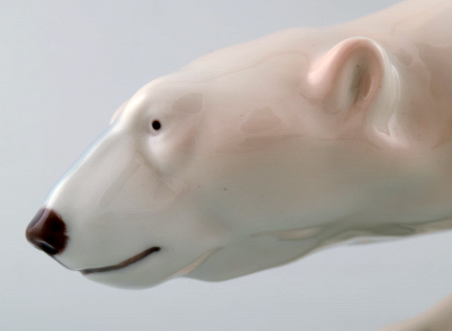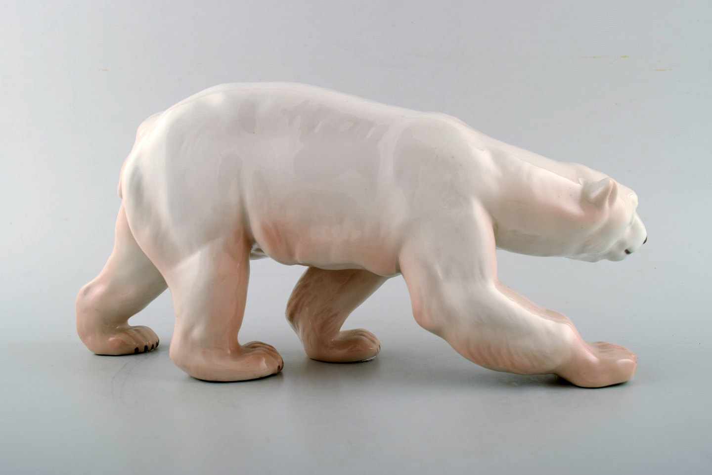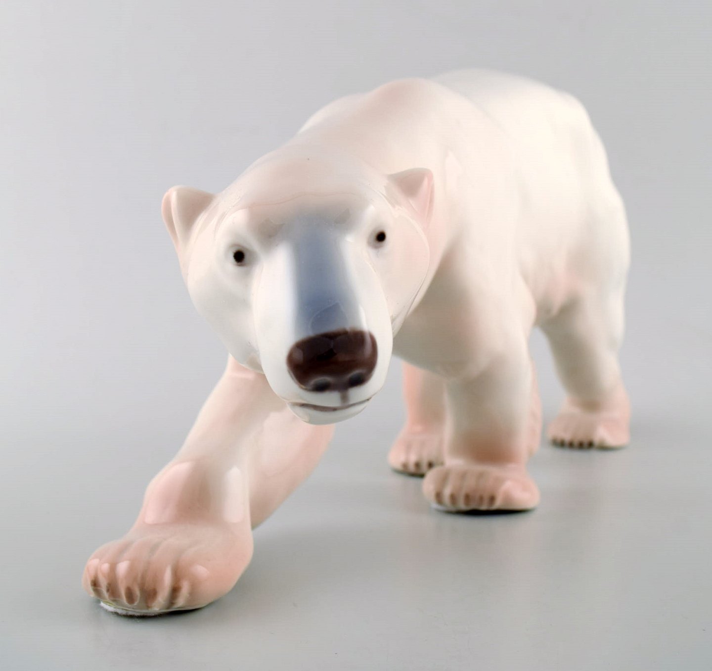 Figur af stor gående isbjørn (nr. 425) fra Royal Copenhagen. Figuren er i 1. sortering og fremstår i perfekt stand. Højde: 14,5 cm. Længde: 30 cm. Tidligt stempel.