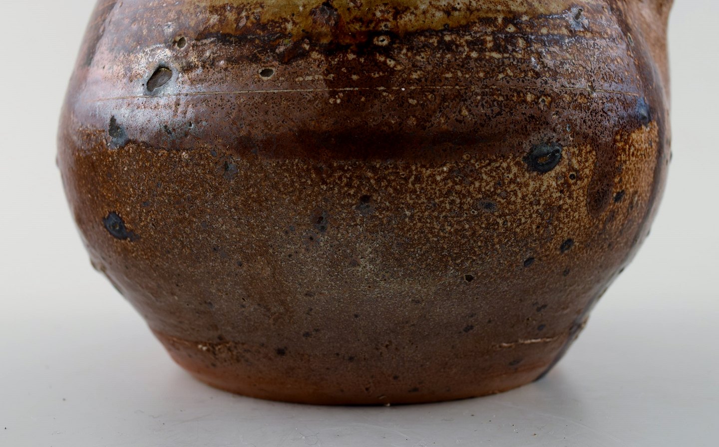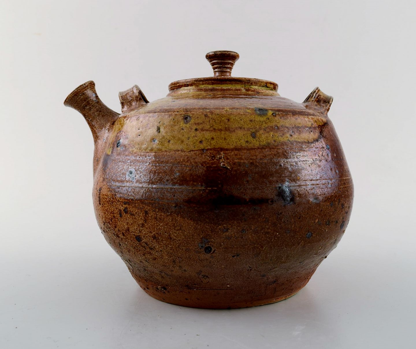 Jean Linard: b. Le Marche 1931, d. Bourges 2010. Stoneware teapot decorated with dark brown and olive green glaze. Signed Linard 64. Unique. Measures : 16 cm. x 15 cm. incl. the handle. In perfect condition.