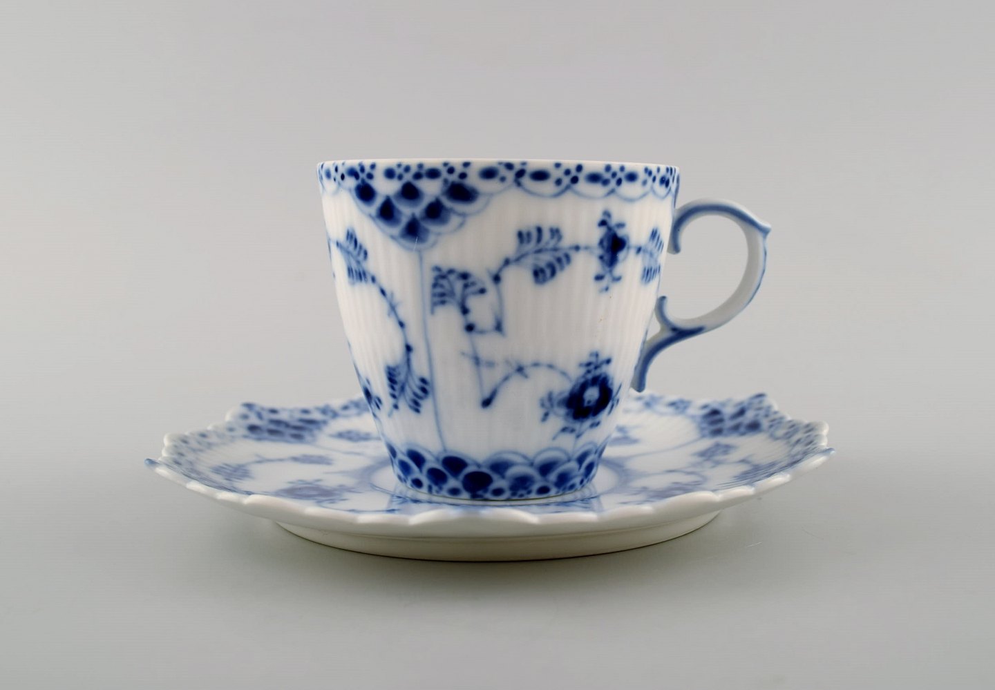 6 sæt Royal Copenhagen musselmalet helblonde mokkakop med underkop. Nummer: 1/1038. 1. sortering, i perfekt stand. Koppens diameter er 6,0 cm., højde 5,4 cm. Underkop 10,5 cm.