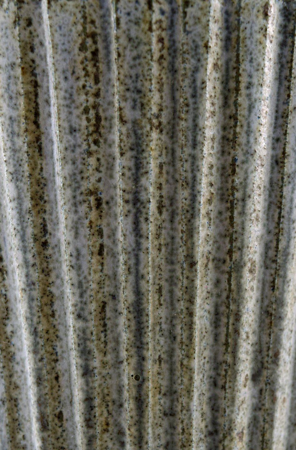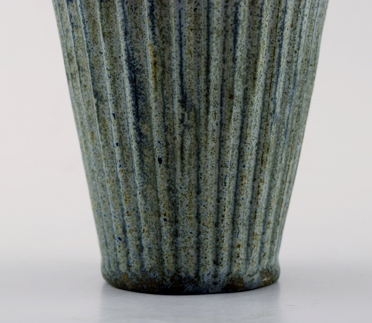 Arne Bang. Keramikvase i rillet stil. Stemplet. Smuk glasur i grønblå nuancer. I perfekt stand. Måler 13 cm. x 9 cm.