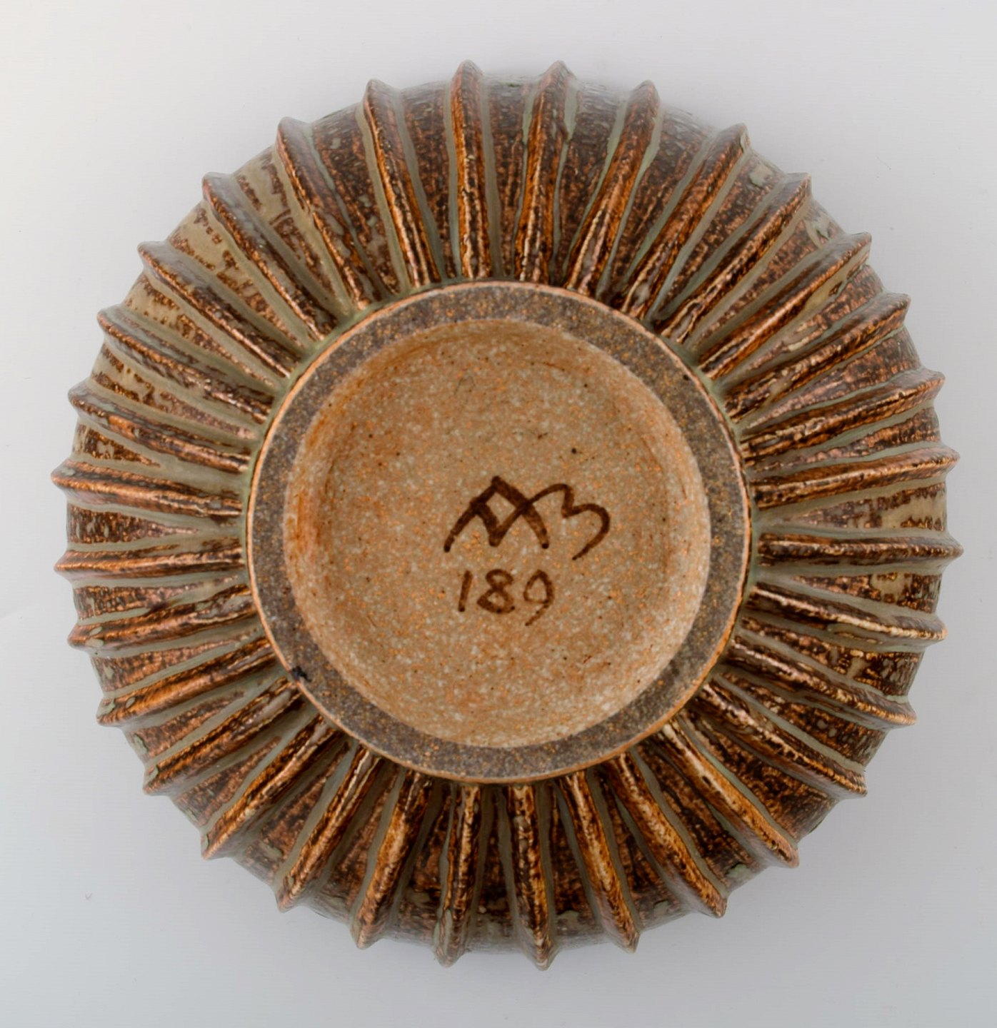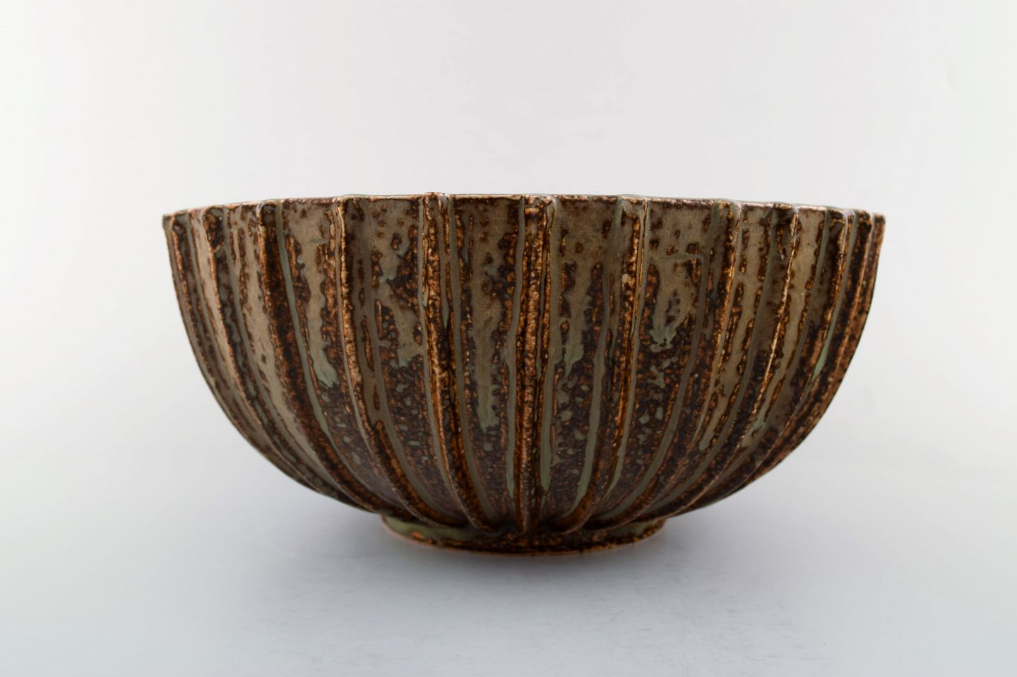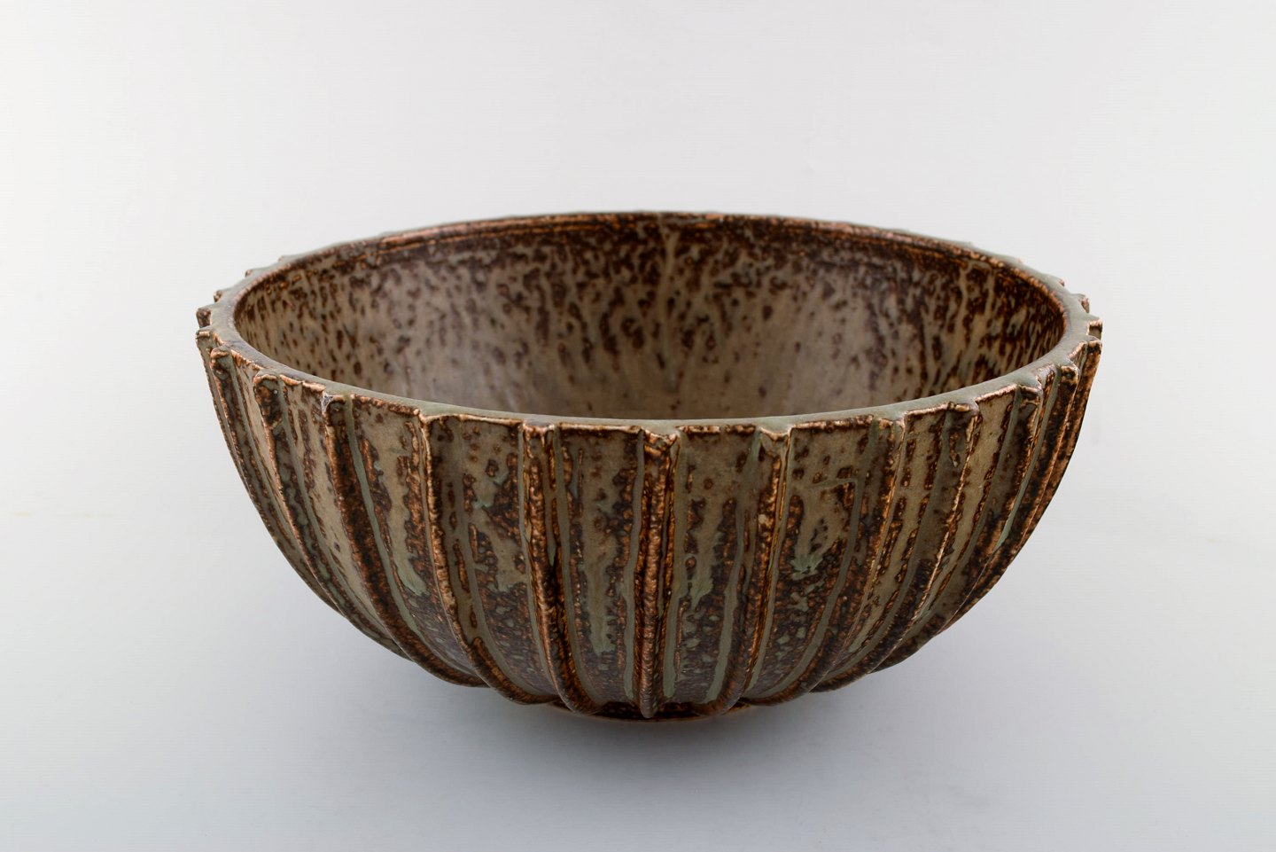 Arne Bang. Stor bordskål af stentøj med kanneleret korpus dekoreret med brun spættet glasur. Signeret i monogram. Nr. 189. Diameter 29 cm. Højde 16 cm. I perfekt stand.