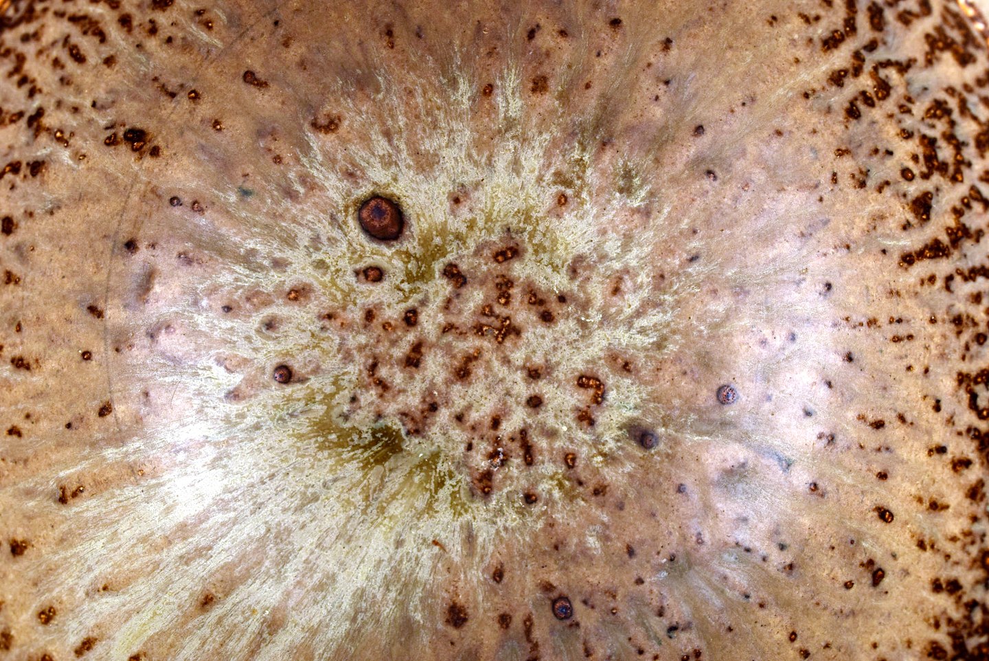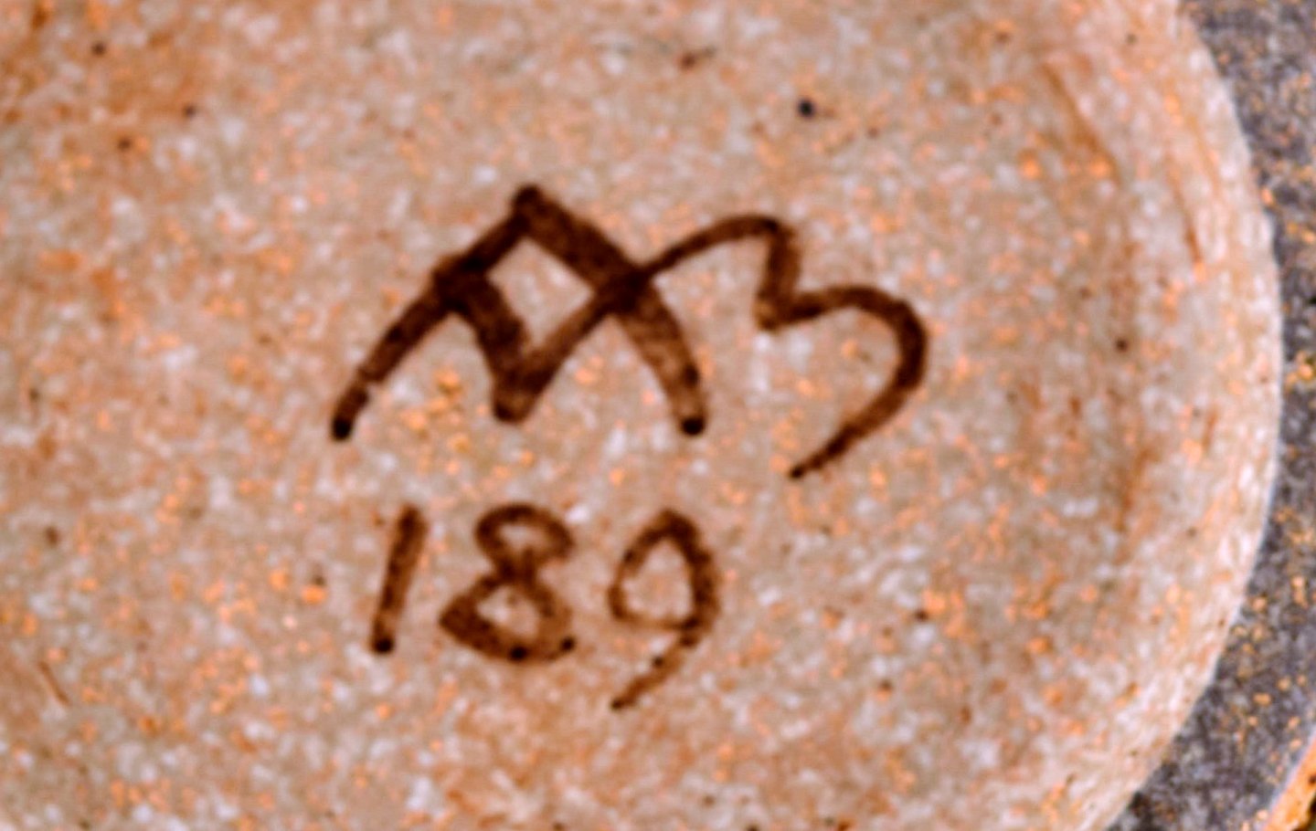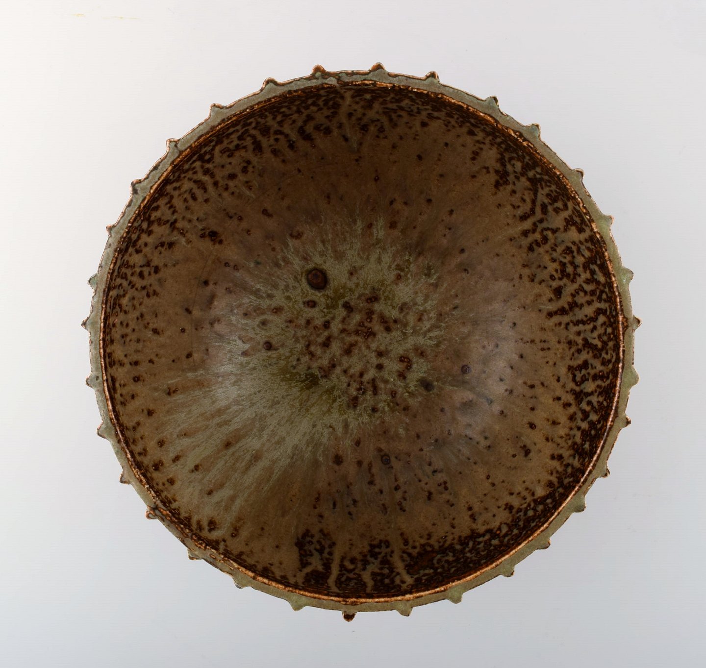 Arne Bang. Stor bordskål af stentøj med kanneleret korpus dekoreret med brun spættet glasur. Signeret i monogram. Nr. 189. Diameter 29 cm. Højde 16 cm. I perfekt stand.