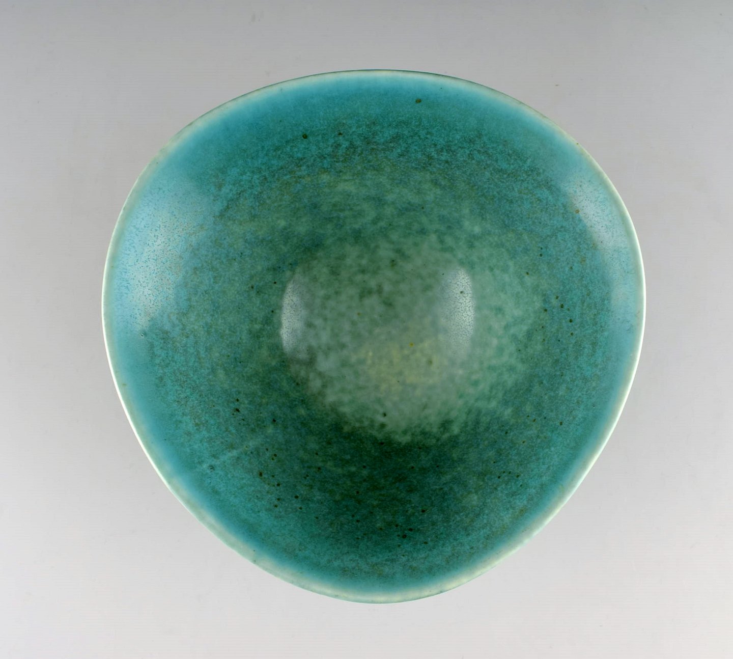 Carl Harry Stålhane, Rörstrand stentøjsskål. Smuk glasur i grønne og turkise nuancer. I perfekt stand, 1. sortering. Måler 19 x 9 cm.