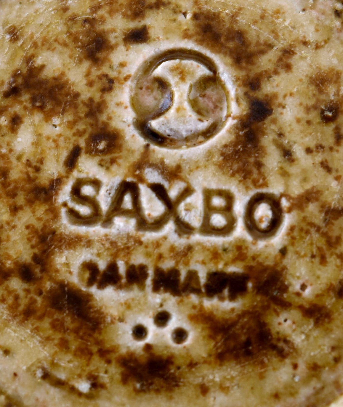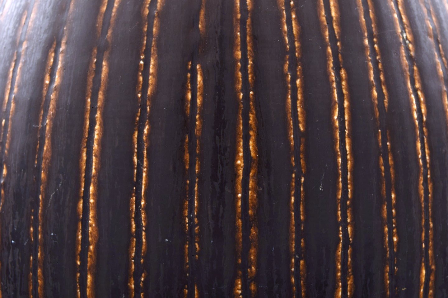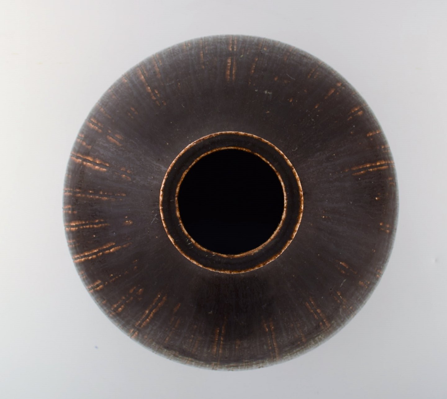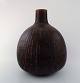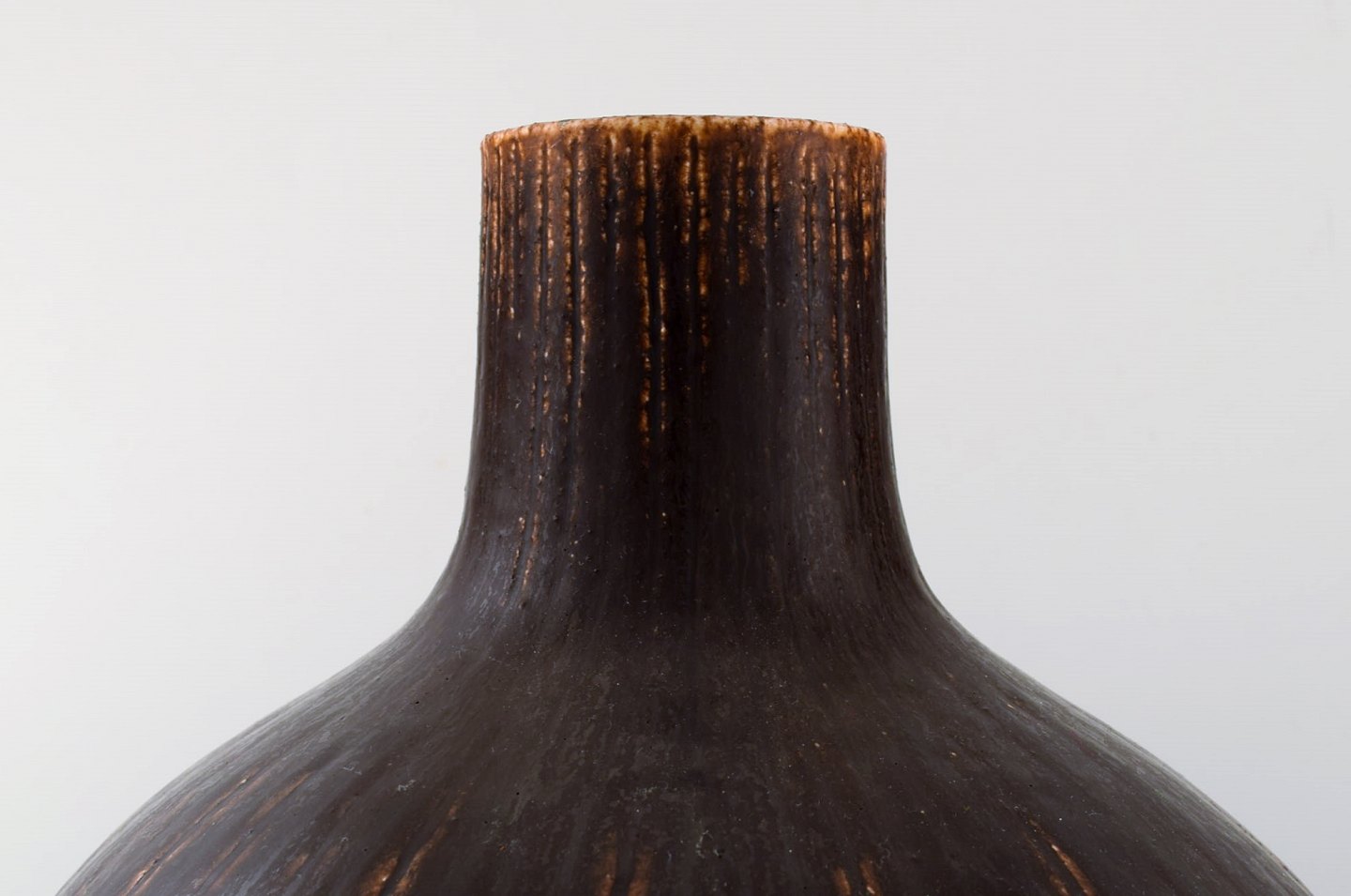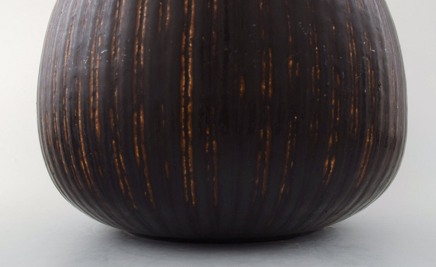 Saxbo: Meget stor og sjælden dråbeformet gulvvase med vertikale indridsninger, dekoreret med mørkebrun glasur. Udført og stemplet hos Saxbo, Danmark. Måler : 41 cm. x 29 cm. I perfekt stand.
