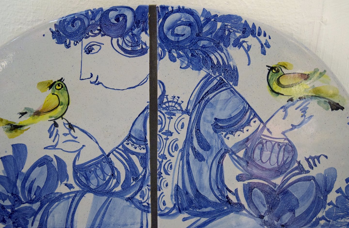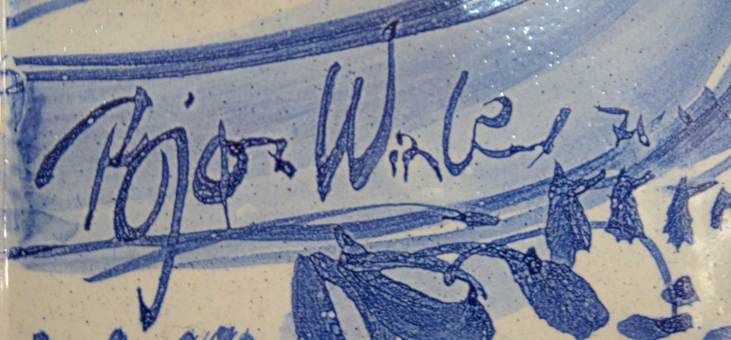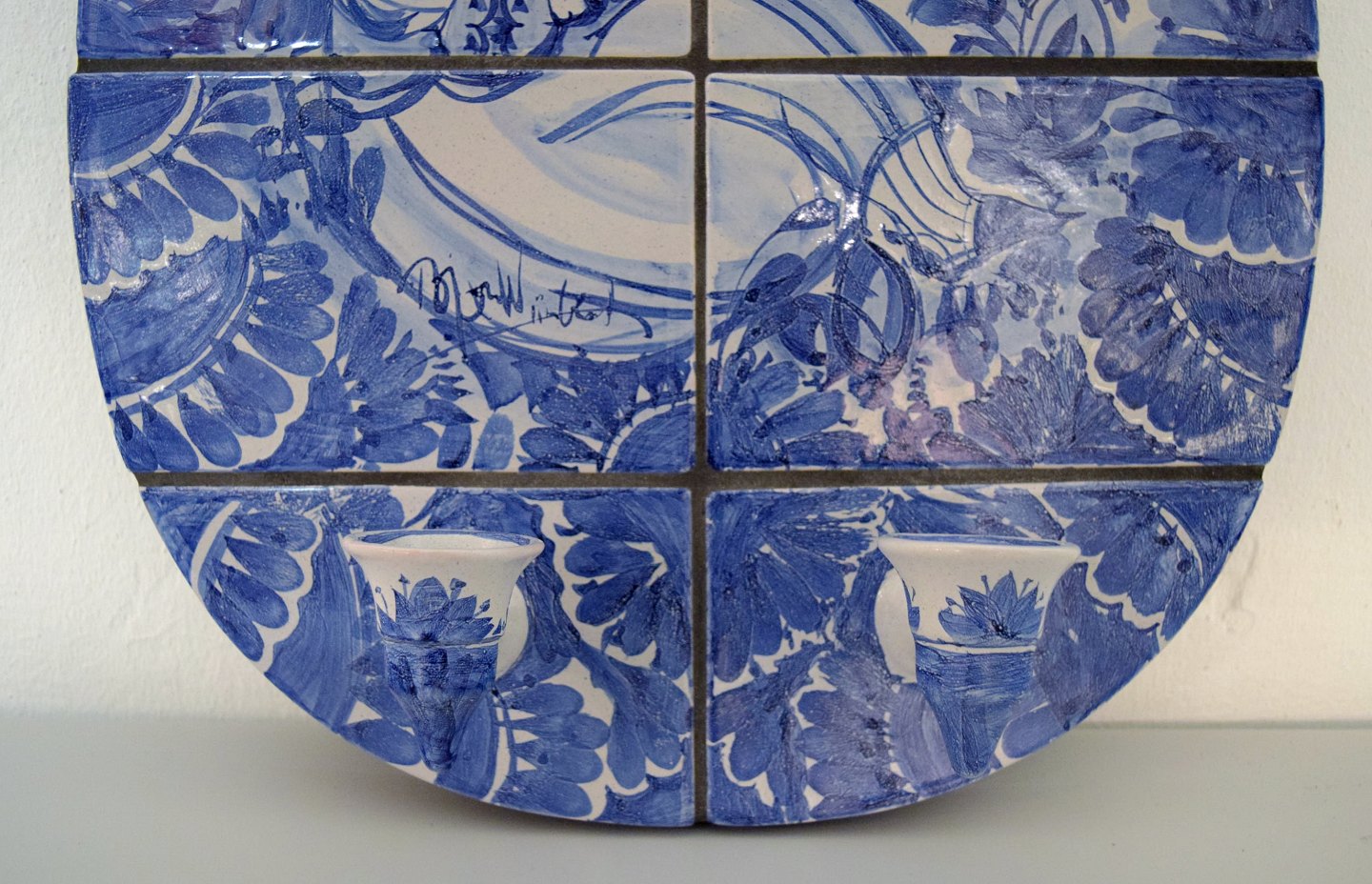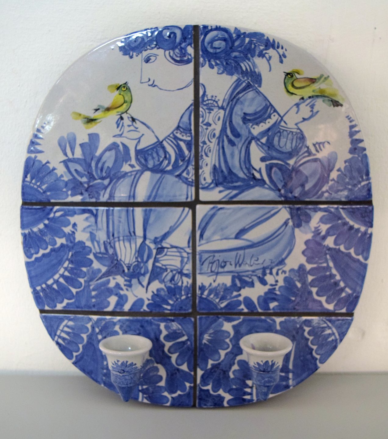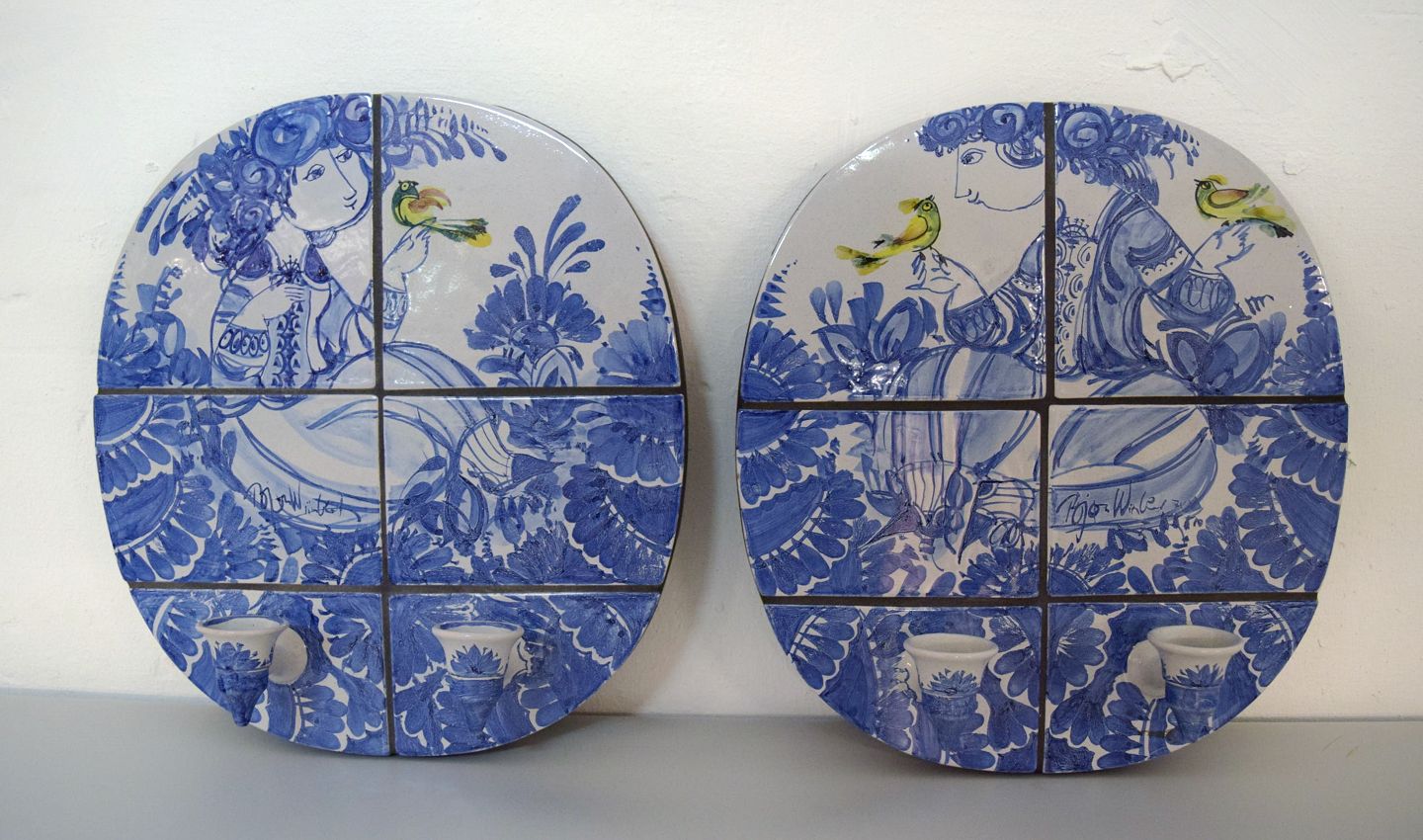 BJØRN WIINBLAD. Very rare unique Wall lights, a pair, signed and dated 71, The Blue house. Round shape, glazed tiles with light arms. Height 42, width 38 cm. In perfect condition.
