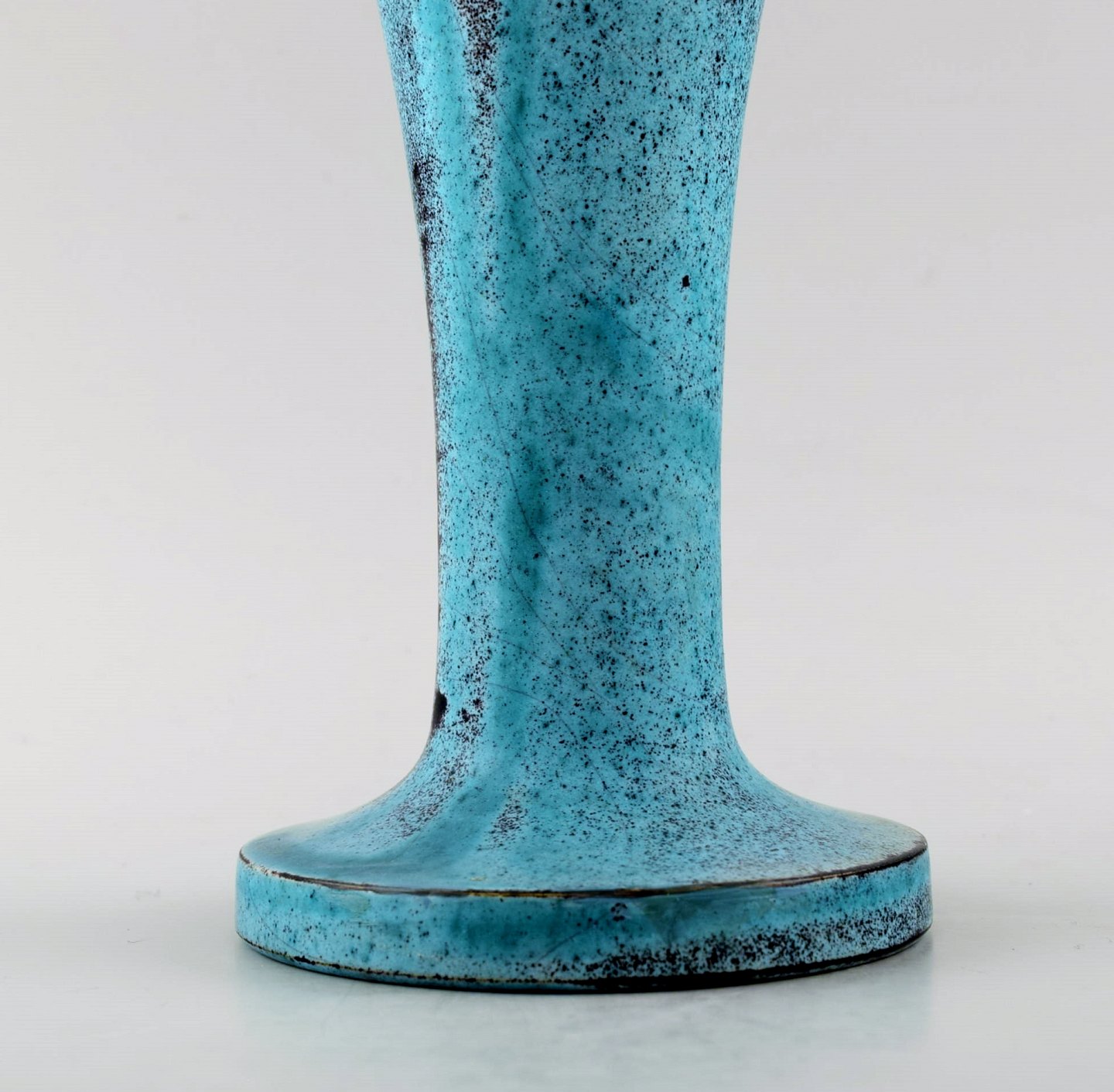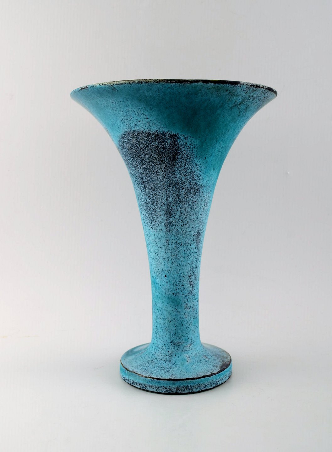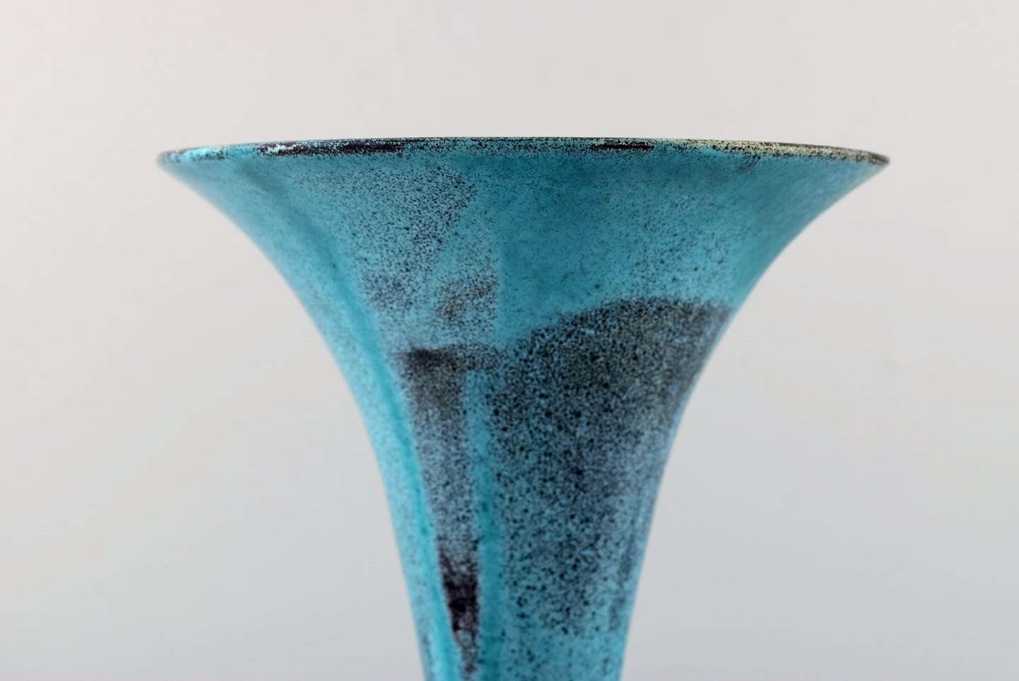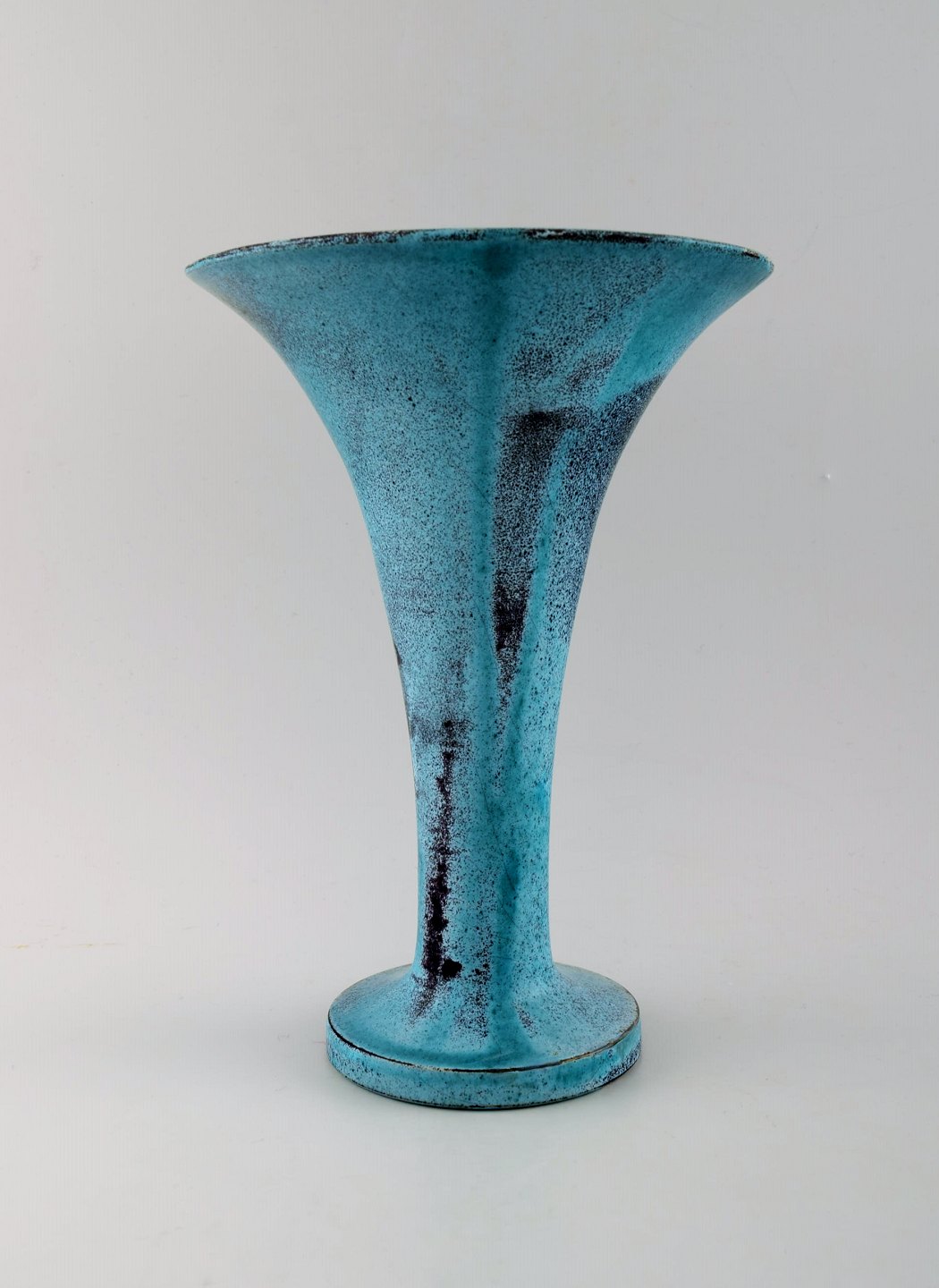 Svend Hammershøi for Kähler, HAK, glaseret stentøjsvase, 1930'erne. Designet af Svend Hammershøi. Trompet formet. Turkisgrøn dobbeltglasur. Måler 24,5 cm. x 17,5 cm. Stemplet. I perfekt stand.