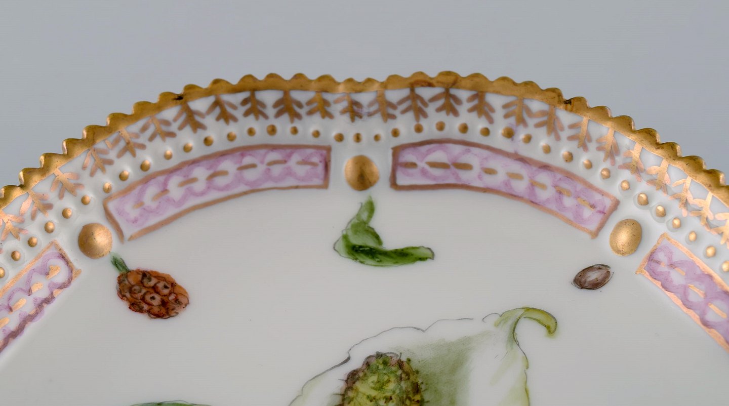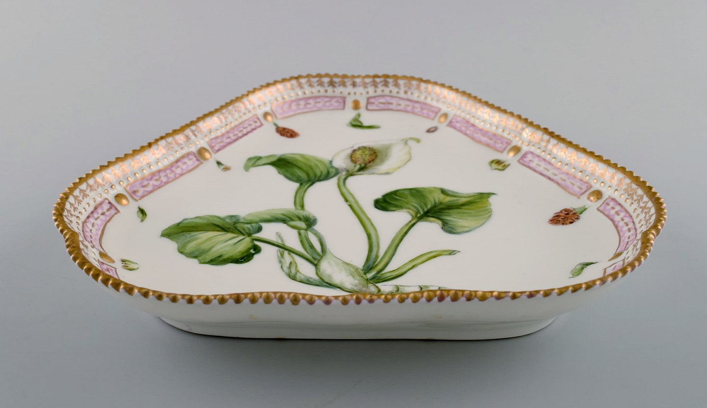 Royal Copenhagen Flora Danica tresidet fad af porcelæn, dekoreret i farver og guld med blomst.