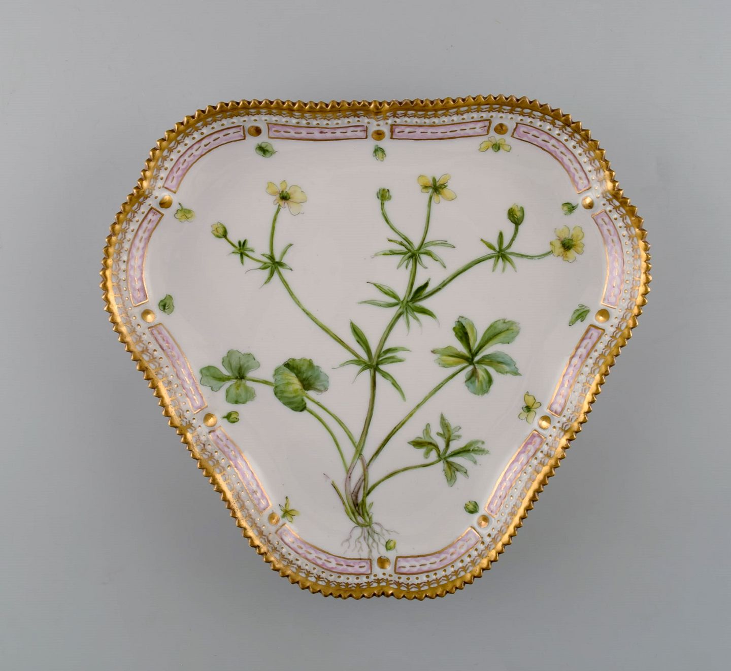Royal Copenhagen Flora Danica tresidet fad af porcelæn, dekoreret i farver og guld med blomst.