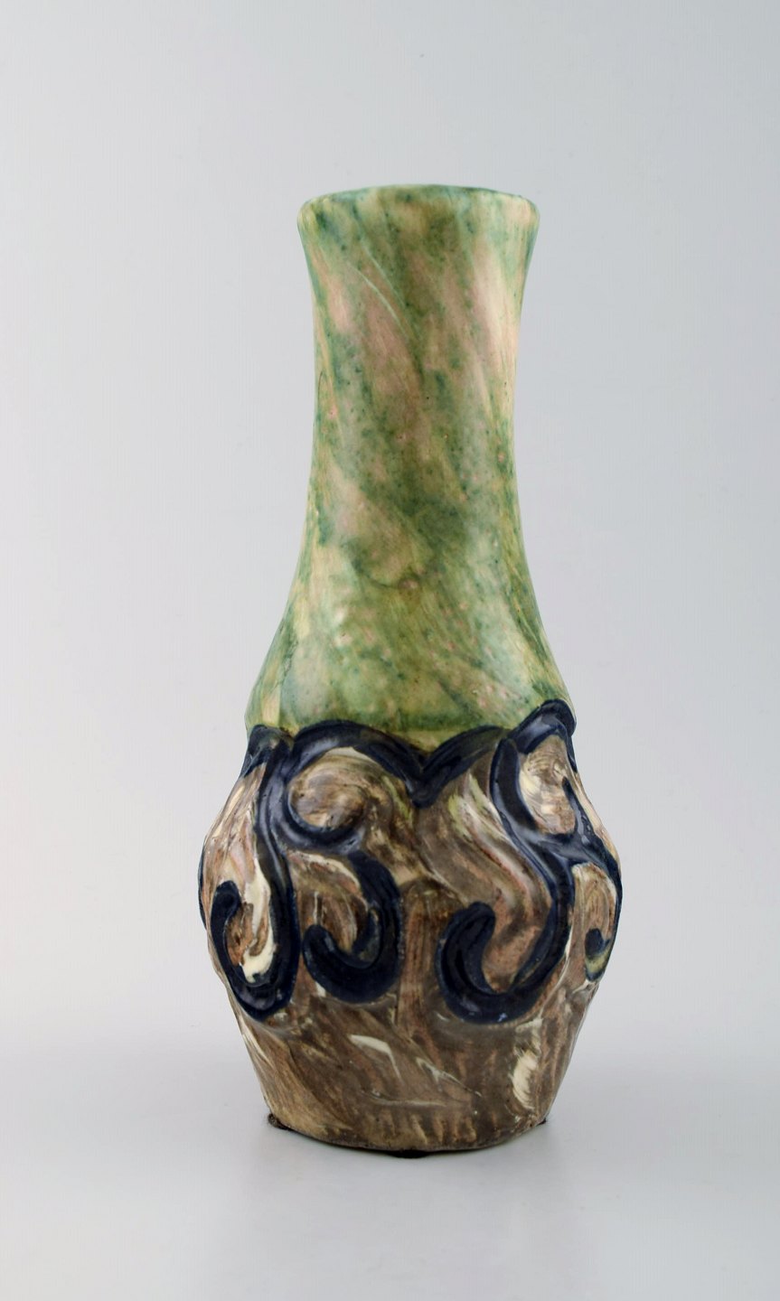 Møller & Bøgely, skønvirke stor keramikvase af glaseret keramik. Ca. 1920. Stort dansk privatsamling af Møller & Bøgely keramik på lager. Måler : 22 cm. x 10,5 cm. I perfekt stand.