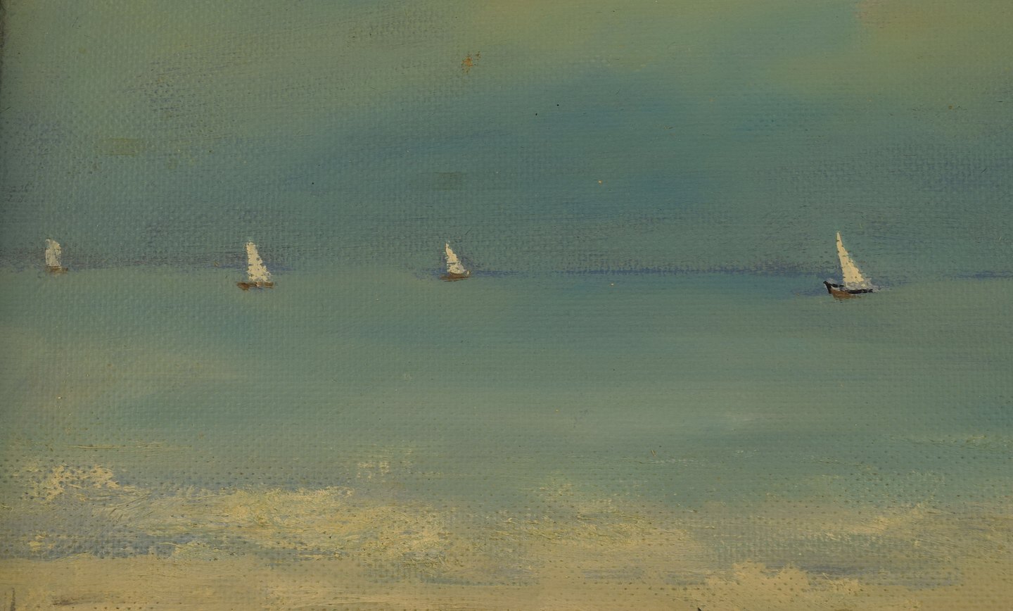 Poul Hansen 1918-1987. Olie på plade. Sejlbåde på havet. Signeret Poul Hansen 75. Måler: 36 cm x 22 cm. Rammen måler 4,5 cm. I flot stand.