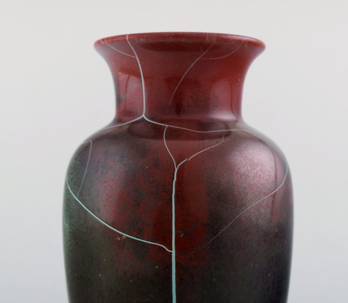 Richard Uhlemeyer, tysk keramiker. Keramikvase, smuk krakeleret glasur i grøn røde nuancer. Tyskland, 1950´erne. Måler 19 cm. x 10,5 cm. I perfekt stand. Stemplet.