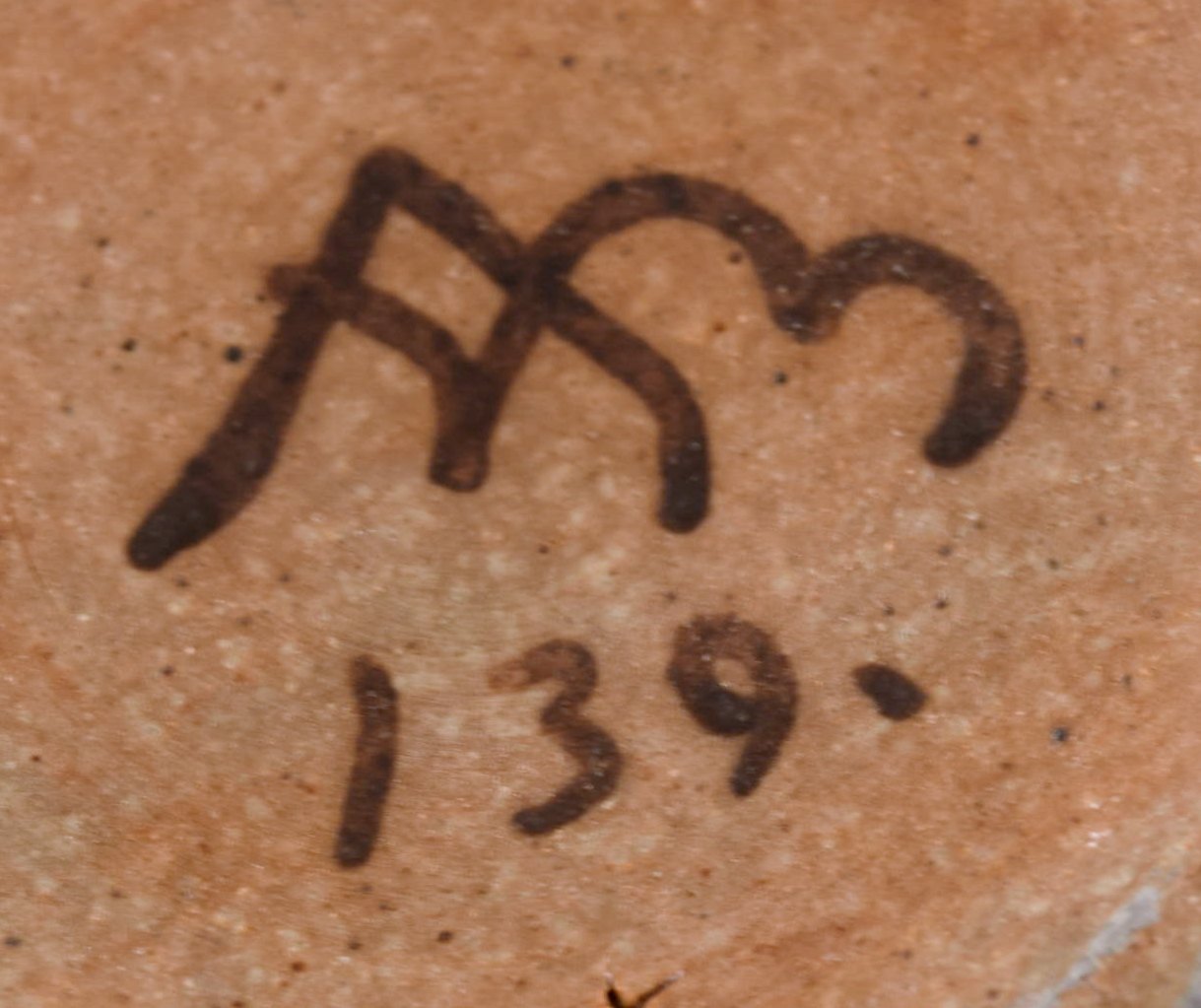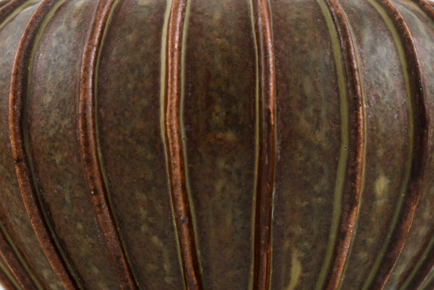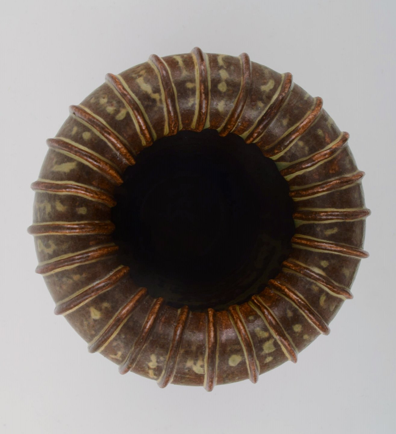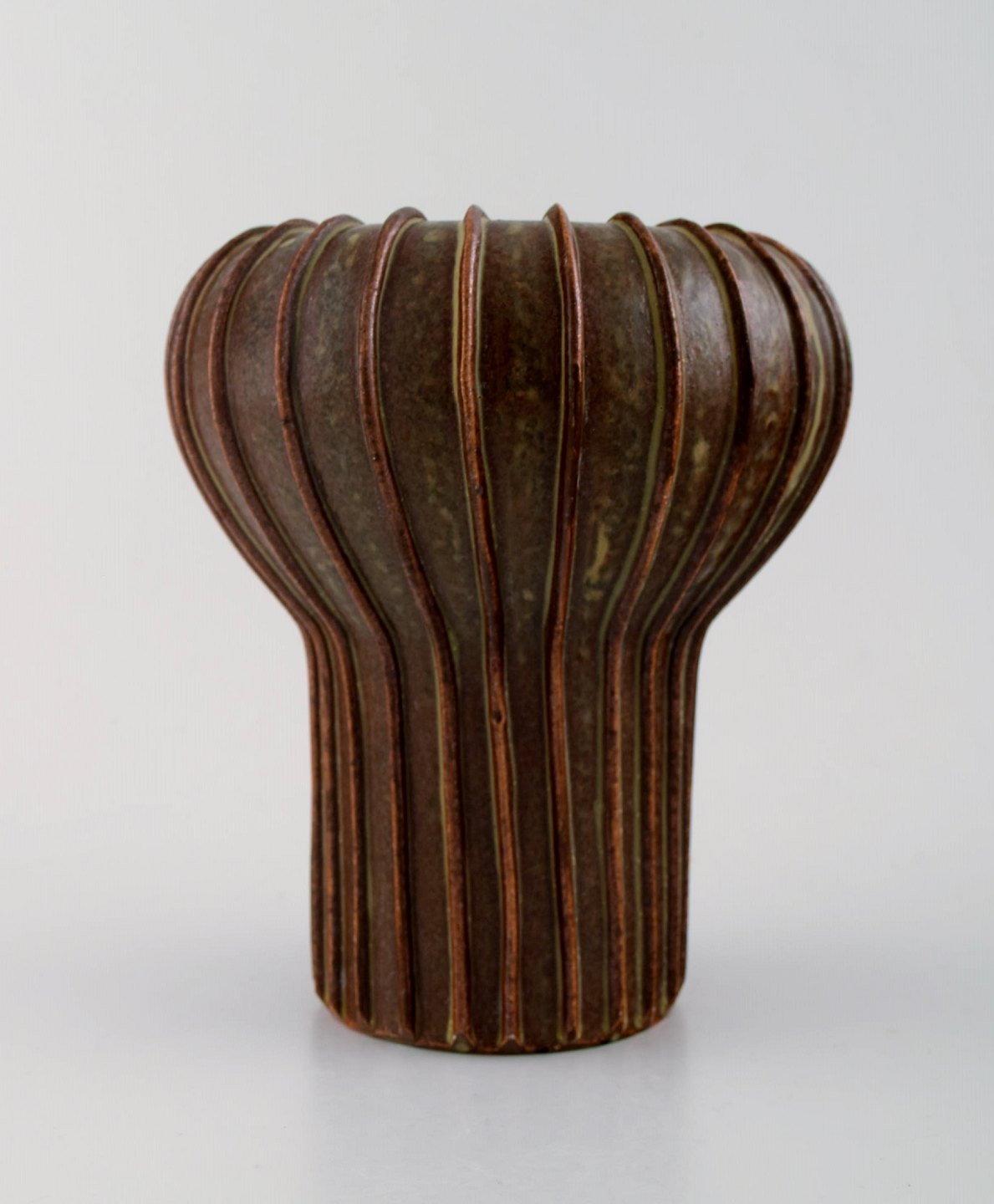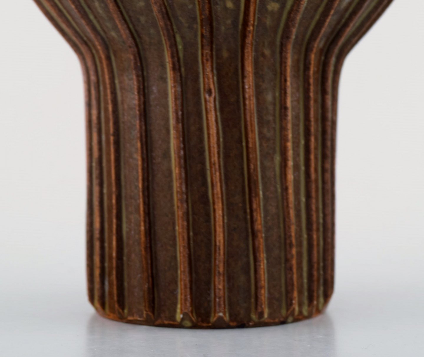Arne Bang. Trompetformet vase af stentøj, modelleret med rillet korpus. Smuk glasur i brune nuancer. Signeret i monogram: AB 139. Måler 15,5 cm x 17,5 cm. I perfekt stand.